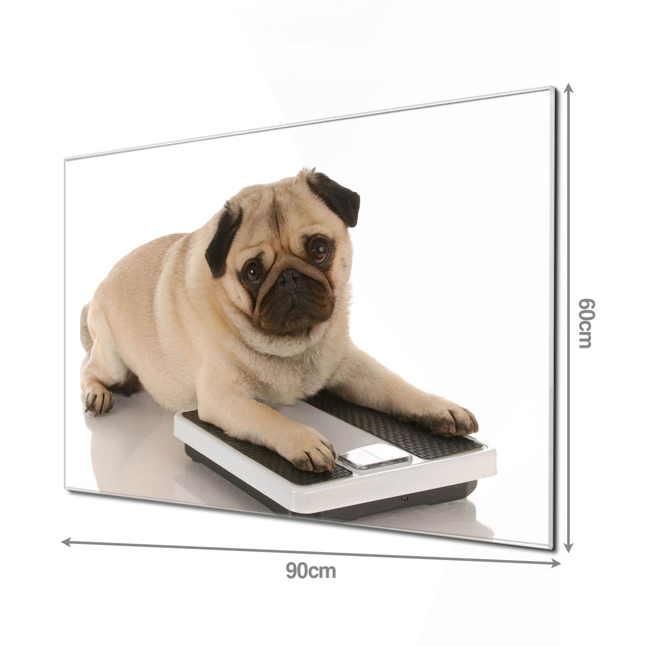Material: 4mm Sicherheitsglas mit Metallrückwand Eigenschaften: beschreibbar, magnetisch, kratzfest Maße: 90x60x0,6cm, 8,10kg schwer Motiv Nummer 10032 Mops Zubehör: inklusive 4 Neodym-Magnete