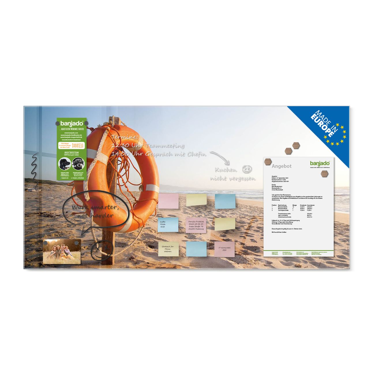 Jede Glas Magnettafel wird in unserer Werkstatt von Hand gefertigt und sorgfältig geprüft. So erhalten Sie ein echtes Qualitätsprodukt, das Funktion und Ästhetik perfekt vereint.?? Warum banjado?