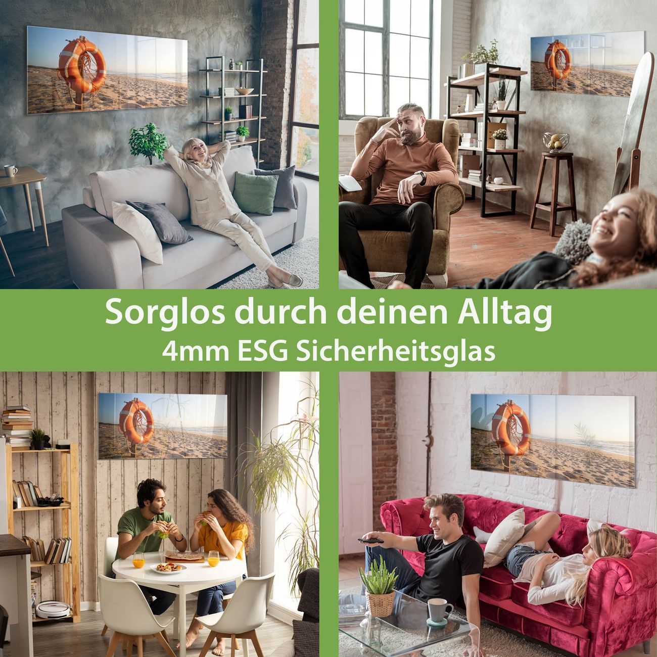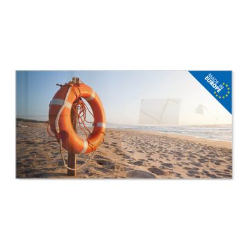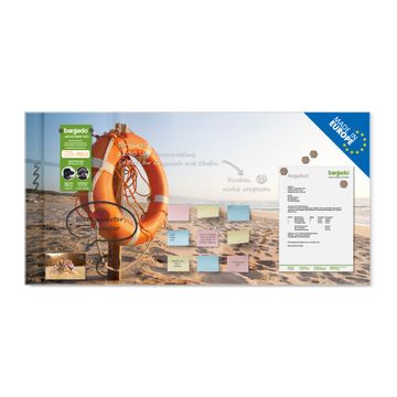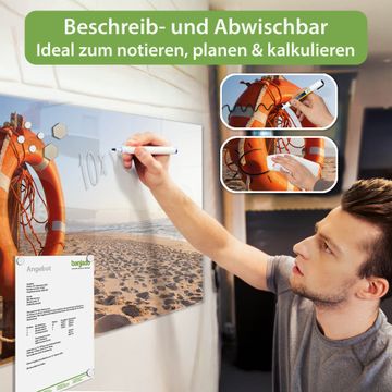 Material: 4mm Sicherheitsglas mit Metallrückwand Eigenschaften: beschreibbar, magnetisch, kratzfest Maße: 100x50x0,6cm, 7,50kg schwer Motiv Nummer 12337 Morgens Am Strand Zubehör: inklusive 4 Neodym-Magnete