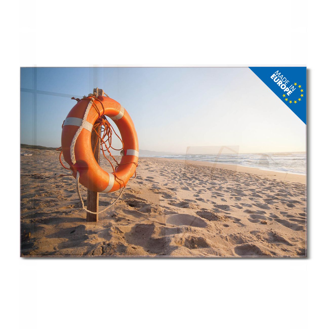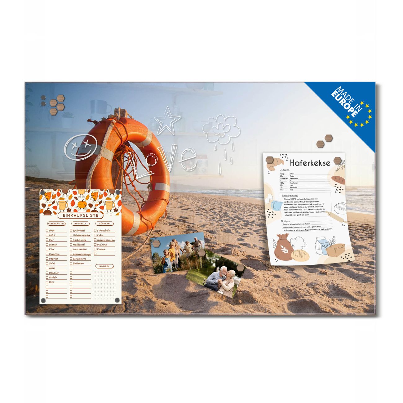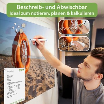 Material: 4mm Sicherheitsglas mit Metallrückwand Eigenschaften: beschreibbar, magnetisch, kratzfest Maße: 45x30x0,6cm, 2,03kg schwer Motiv Nummer 12337 Morgens Am Strand Zubehör: inklusive 4 Neodym-Magnete