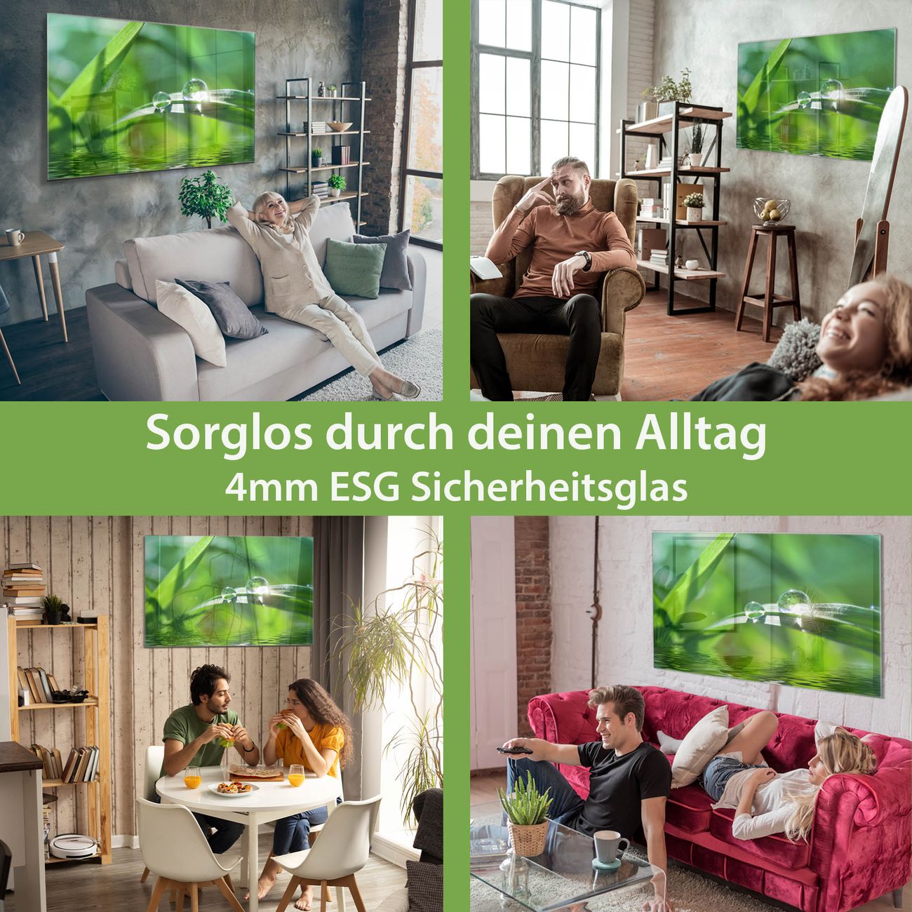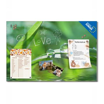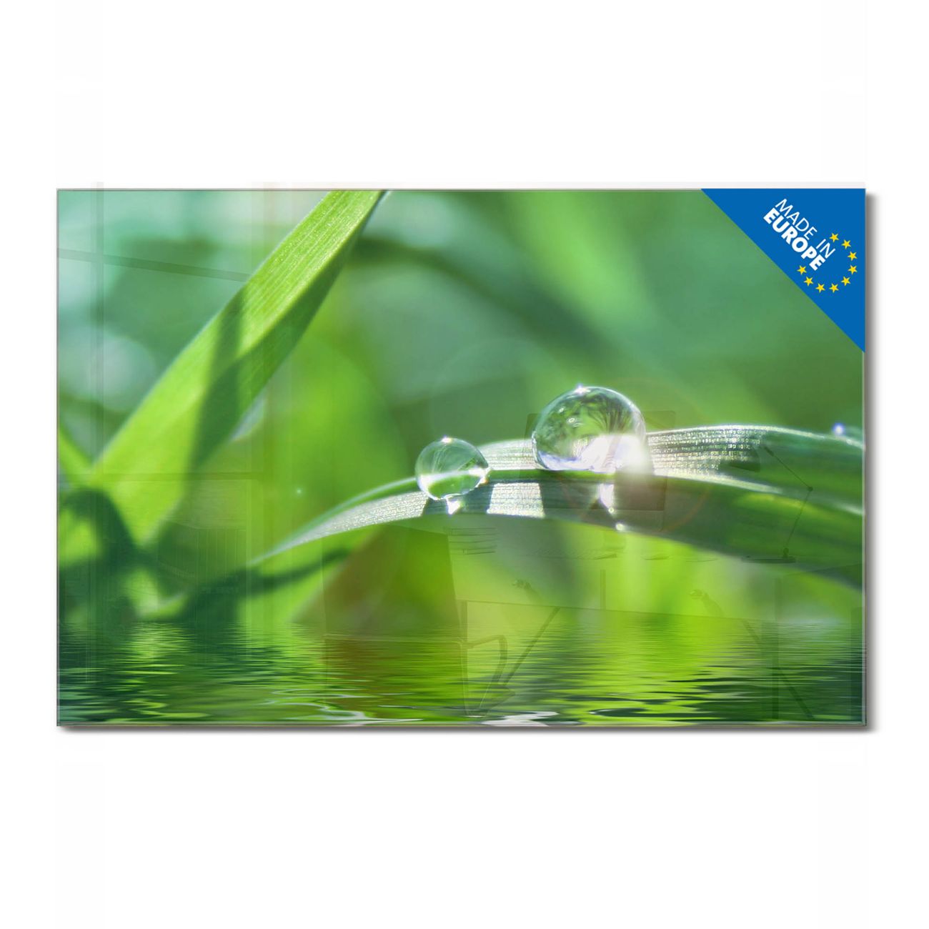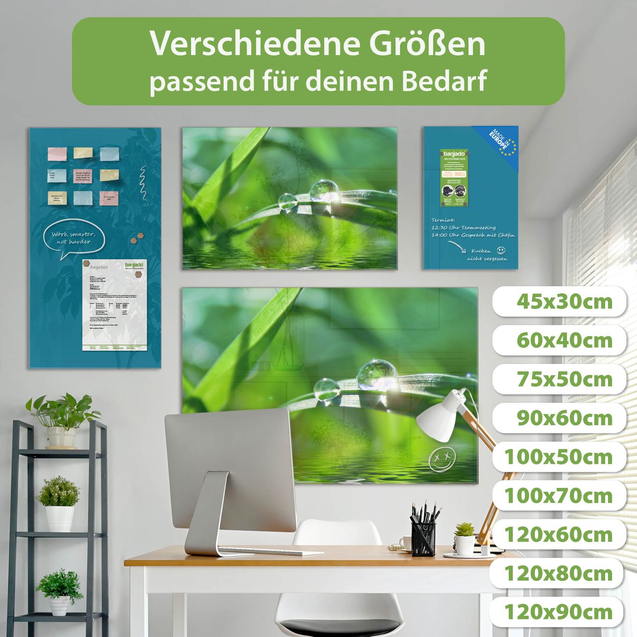 Material: 4mm Sicherheitsglas mit Metallrückwand Eigenschaften: beschreibbar, magnetisch, kratzfest Maße: 75x50x0,6cm, 5,63kg schwer Motiv Nummer 10235 Morgentau Zubehör: inklusive 4 Neodym-Magnete