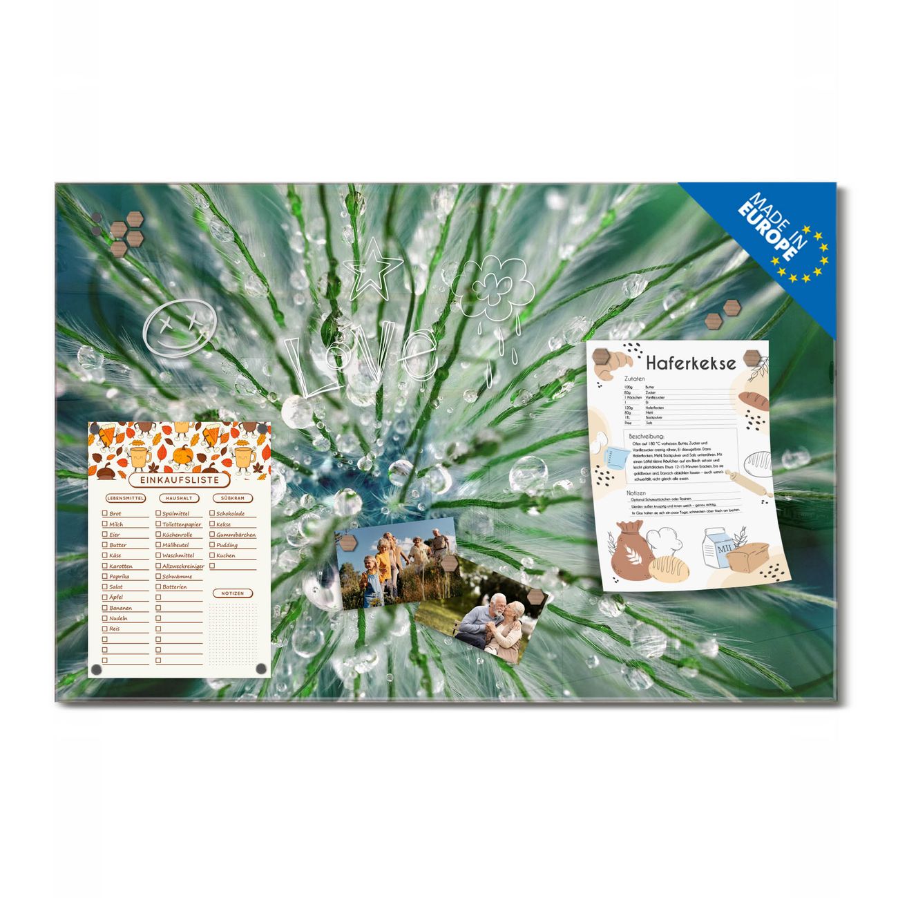 Ein Stück Design, das Ihren Alltag organisiert. Schreiben, heften, inspirieren - alles an einem Ort. Qualität, die man spürt. Montage leicht gemacht. Handwerk mit Herz - veredelt in Sachsen. Einzigartiges Design mit Motiv Motiv Blüte Mit Tautropfen Beschreibbare Glasoberfläche, leicht zu reinigen Starke Magnetkraft durch Stahlrückwand Inklusive 4 Neodym-Magneten Flexible Montageoptionen Handveredelt in Sachsen - Qualität, die bleibt