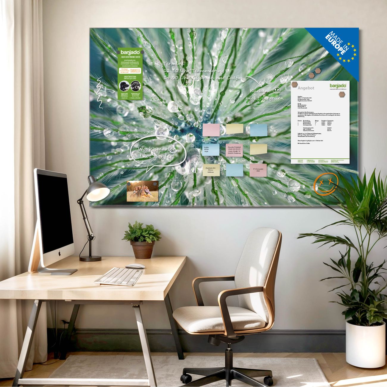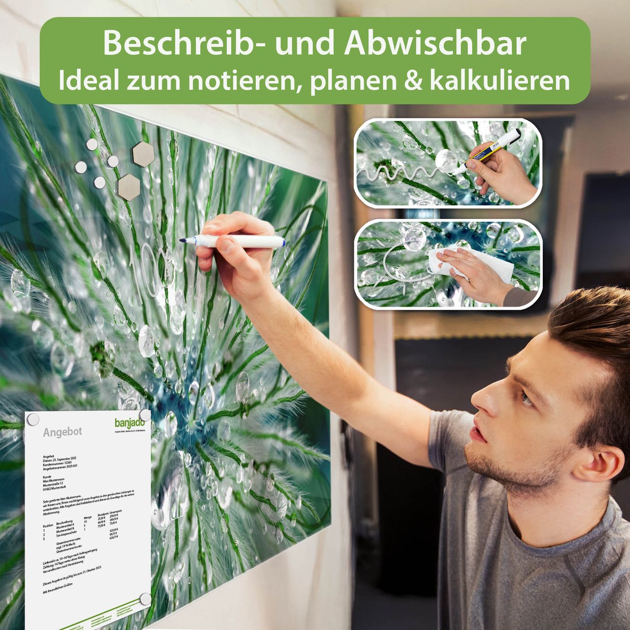 Jede Glas Magnettafel wird in unserer Werkstatt von Hand gefertigt und sorgfältig geprüft. So erhalten Sie ein echtes Qualitätsprodukt, das Funktion und Ästhetik perfekt vereint.?? Warum banjado?