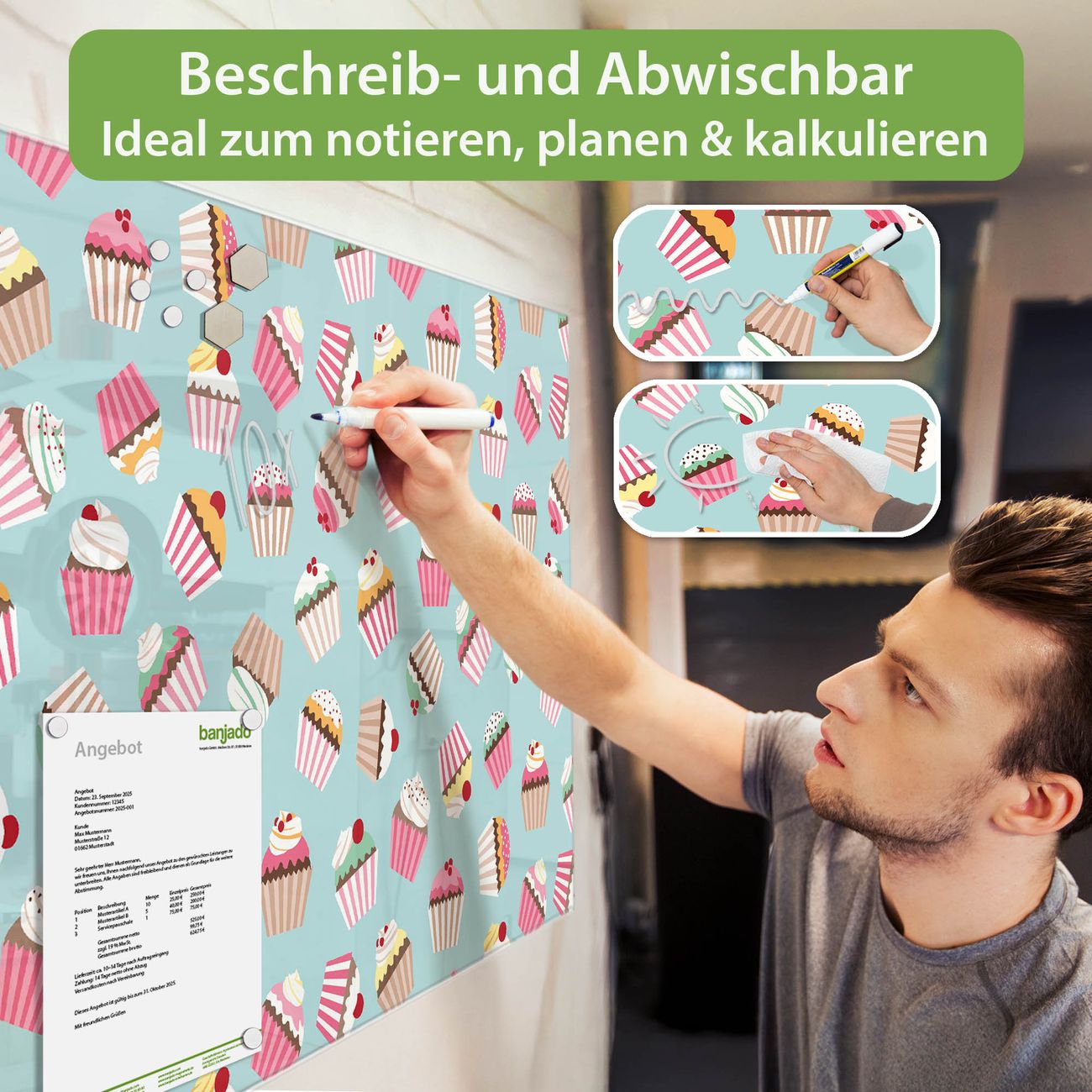 Ein Stück Design, das Ihren Alltag organisiert. Schreiben, heften, inspirieren - alles an einem Ort. Qualität, die man spürt. Montage leicht gemacht. Handwerk mit Herz - veredelt in Sachsen. Einzigartiges Design mit Motiv Motiv Muffins Beschreibbare Glasoberfläche, leicht zu reinigen Starke Magnetkraft durch Stahlrückwand Inklusive 4 Neodym-Magneten Flexible Montageoptionen Handveredelt in Sachsen - Qualität, die bleibt