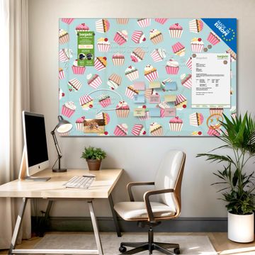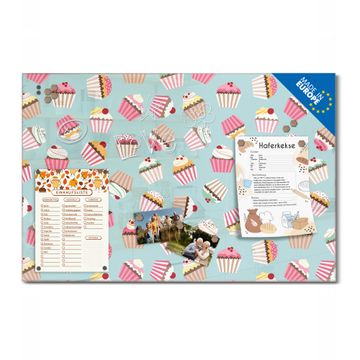 Material: 4mm Sicherheitsglas mit Metallrückwand Eigenschaften: beschreibbar, magnetisch, kratzfest Maße: 45x30x0,6cm, 2,03kg schwer Motiv Nummer 11066 Muffins Zubehör: inklusive 4 Neodym-Magnete