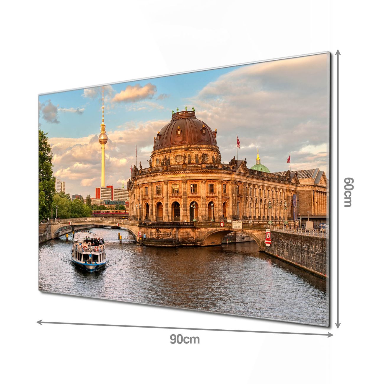 Material: 4mm Sicherheitsglas mit Metallrückwand Eigenschaften: beschreibbar, magnetisch, kratzfest Maße: 90x60x0,6cm, 8,10kg schwer Motiv Nummer 12403 Museumsinsel Zubehör: inklusive 4 Neodym-Magnete