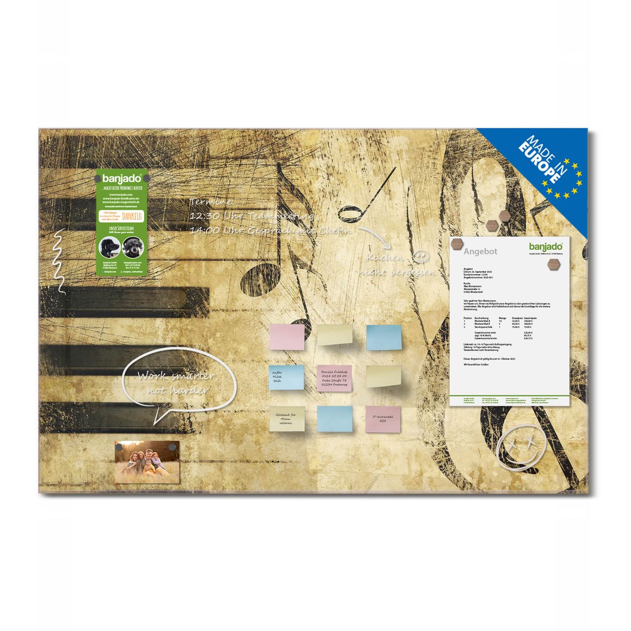 Jede Glas Magnettafel wird in unserer Werkstatt von Hand gefertigt und sorgfältig geprüft. So erhalten Sie ein echtes Qualitätsprodukt, das Funktion und Ästhetik perfekt vereint.?? Warum banjado?