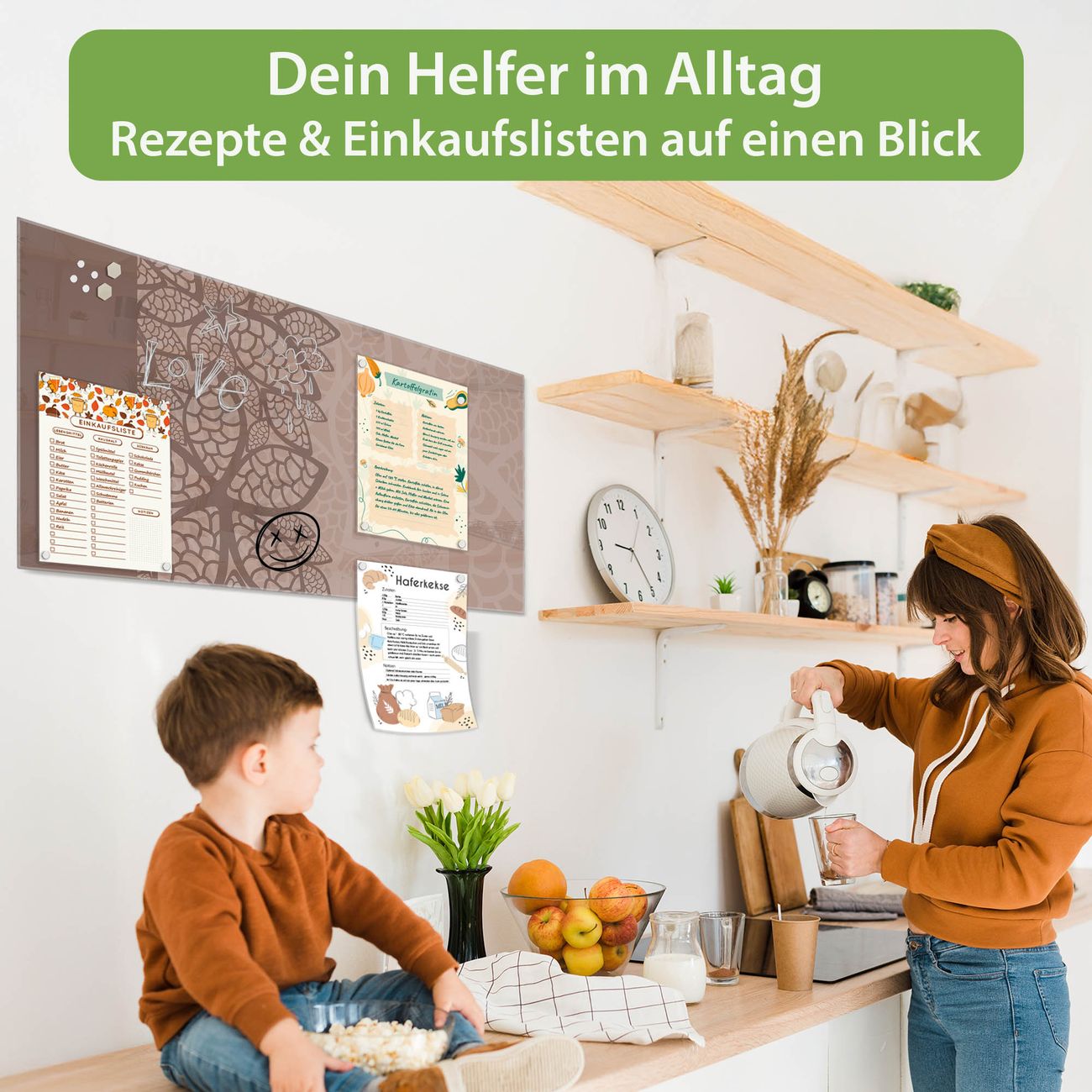 Auf der glatten Glasoberfläche lassen sich Termine, Rezepte oder Notizen ganz einfach mit Kreidestiften festhalten und rückstandslos entfernen. Starke Neodym-Magnete halten Ihre wichtigsten Erinnerungen sicher an Ort und Stelle. So entsteht Ihre ganz persönliche Ideenwand - jeden Tag neu.
