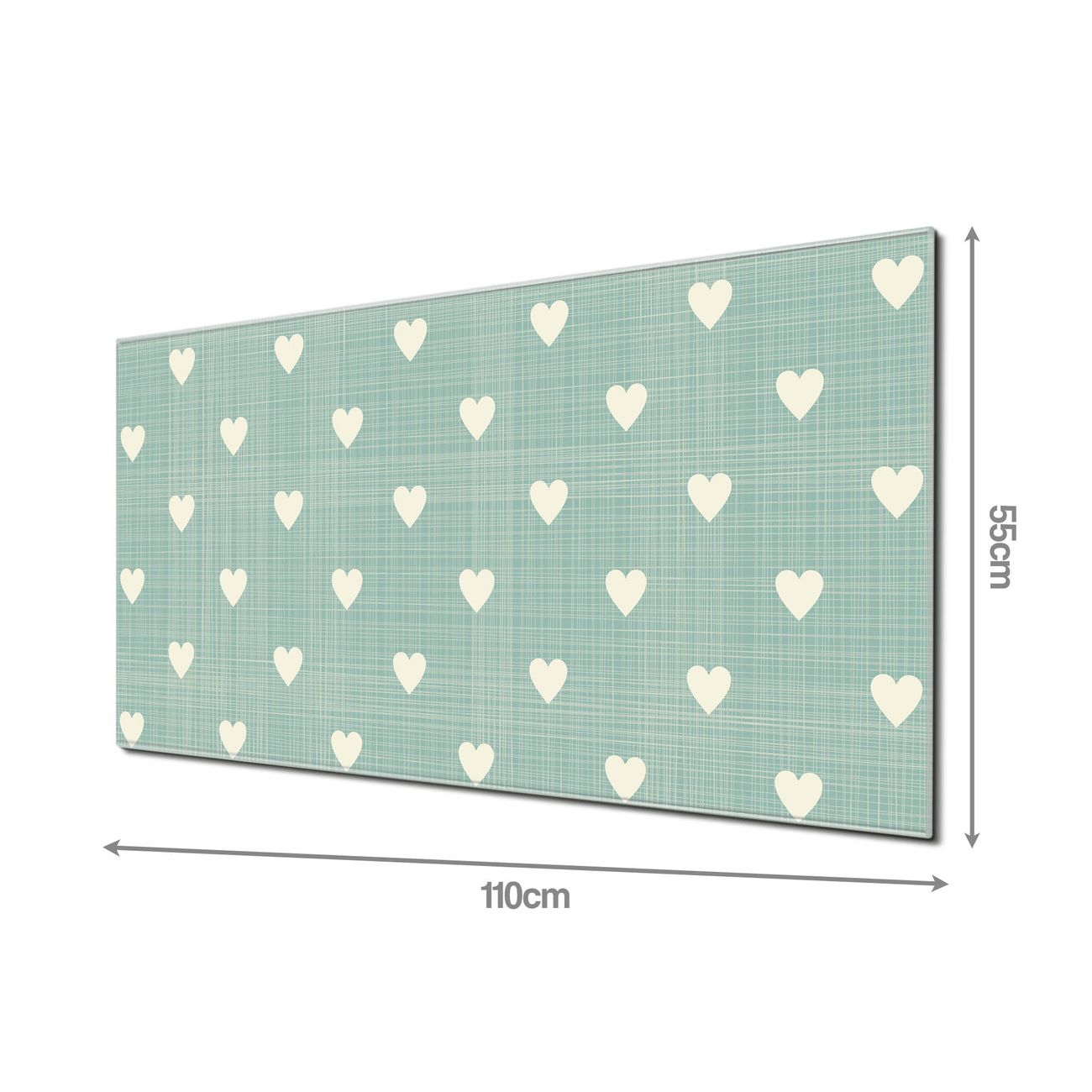 Material: 4mm Sicherheitsglas mit Metallrückwand Eigenschaften: beschreibbar, magnetisch, kratzfest Maße: 110x55x0,6cm, 9,08kg schwer Motiv Nummer 10382 Muster Herzen Zubehör: inklusive 4 Neodym-Magnete