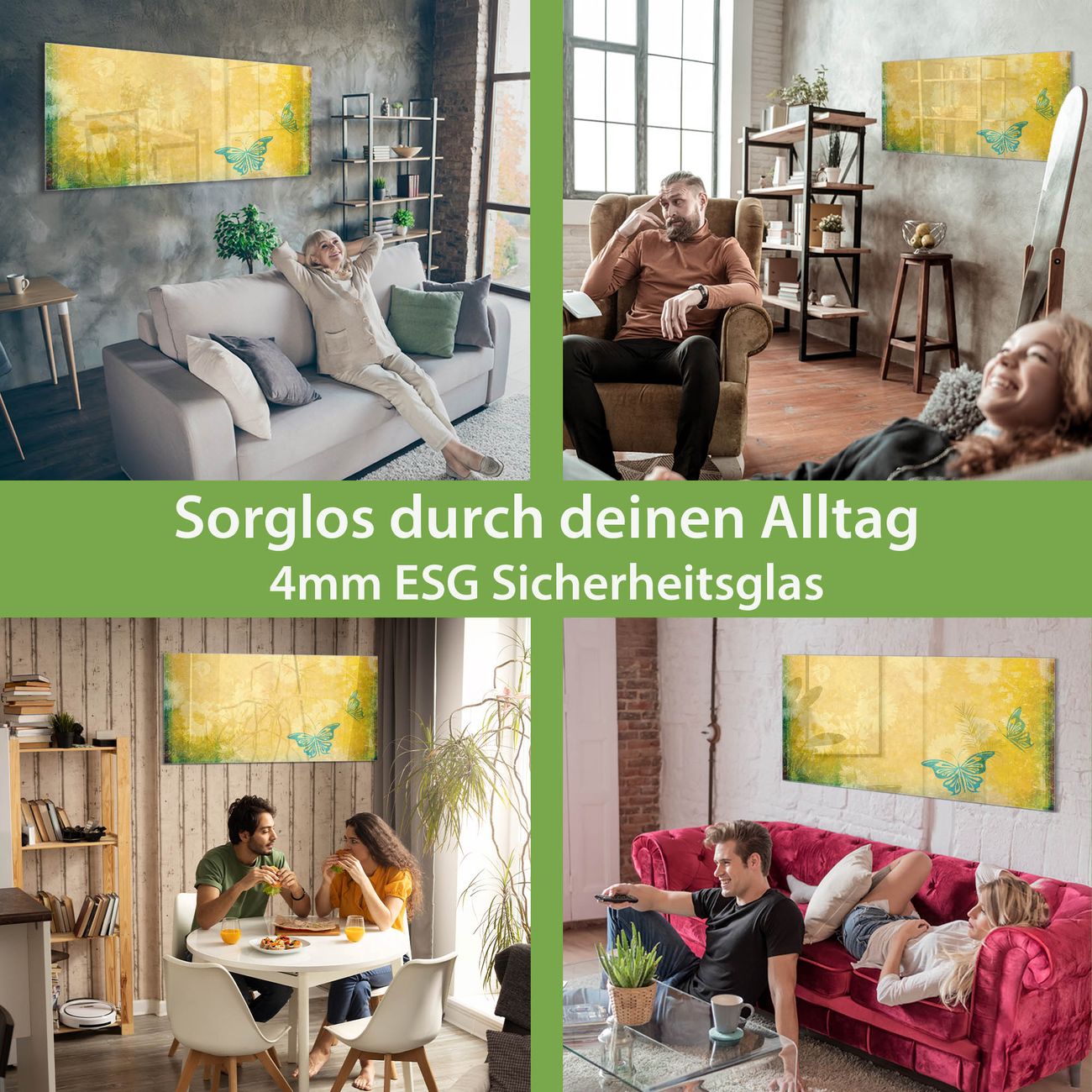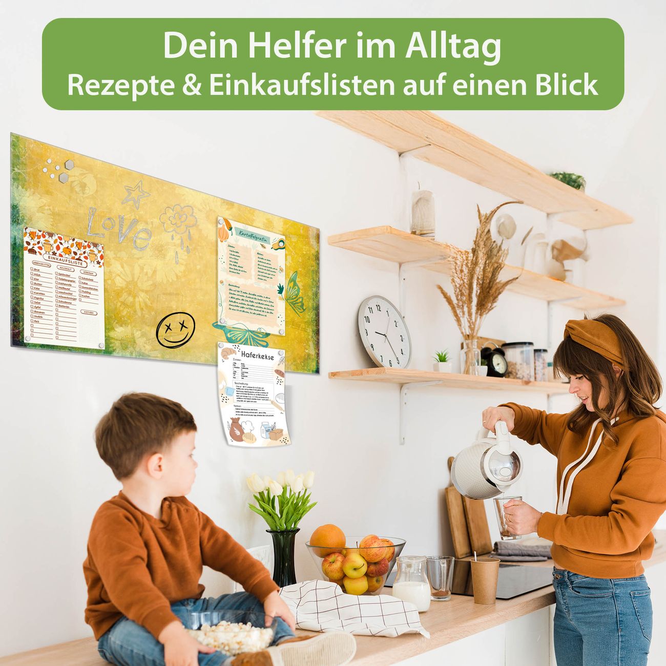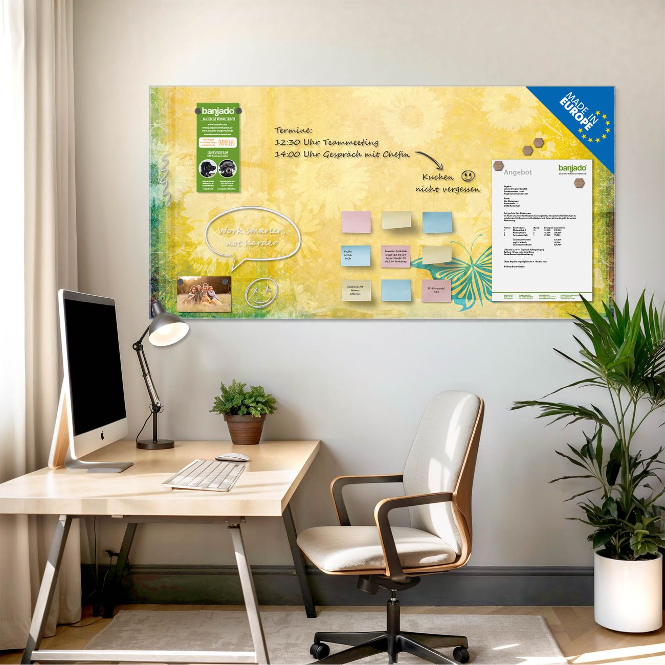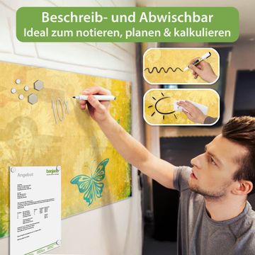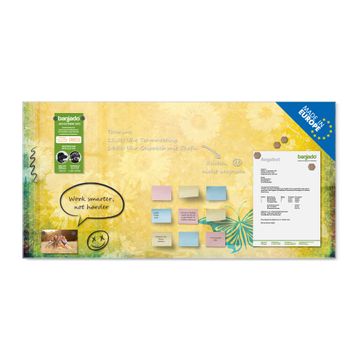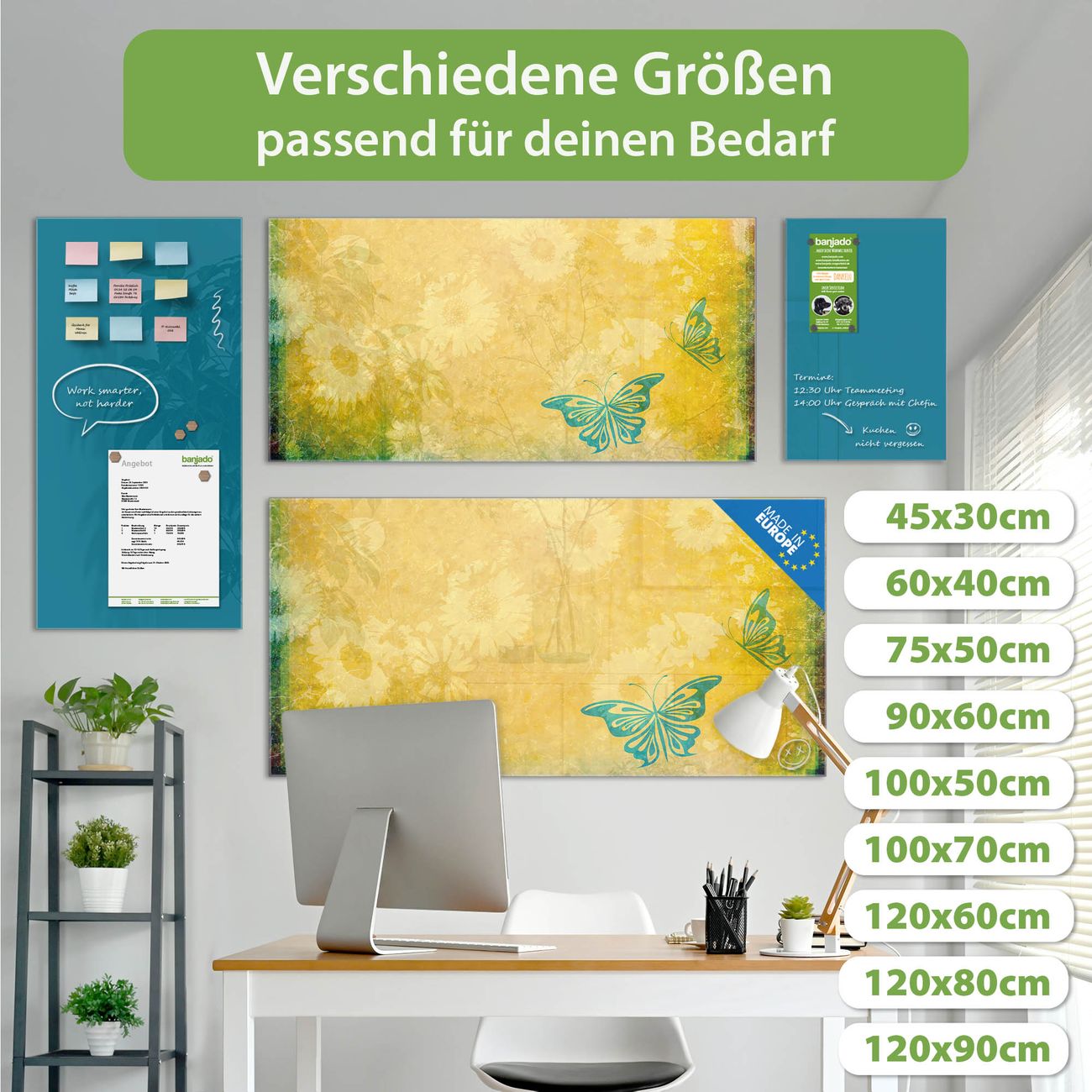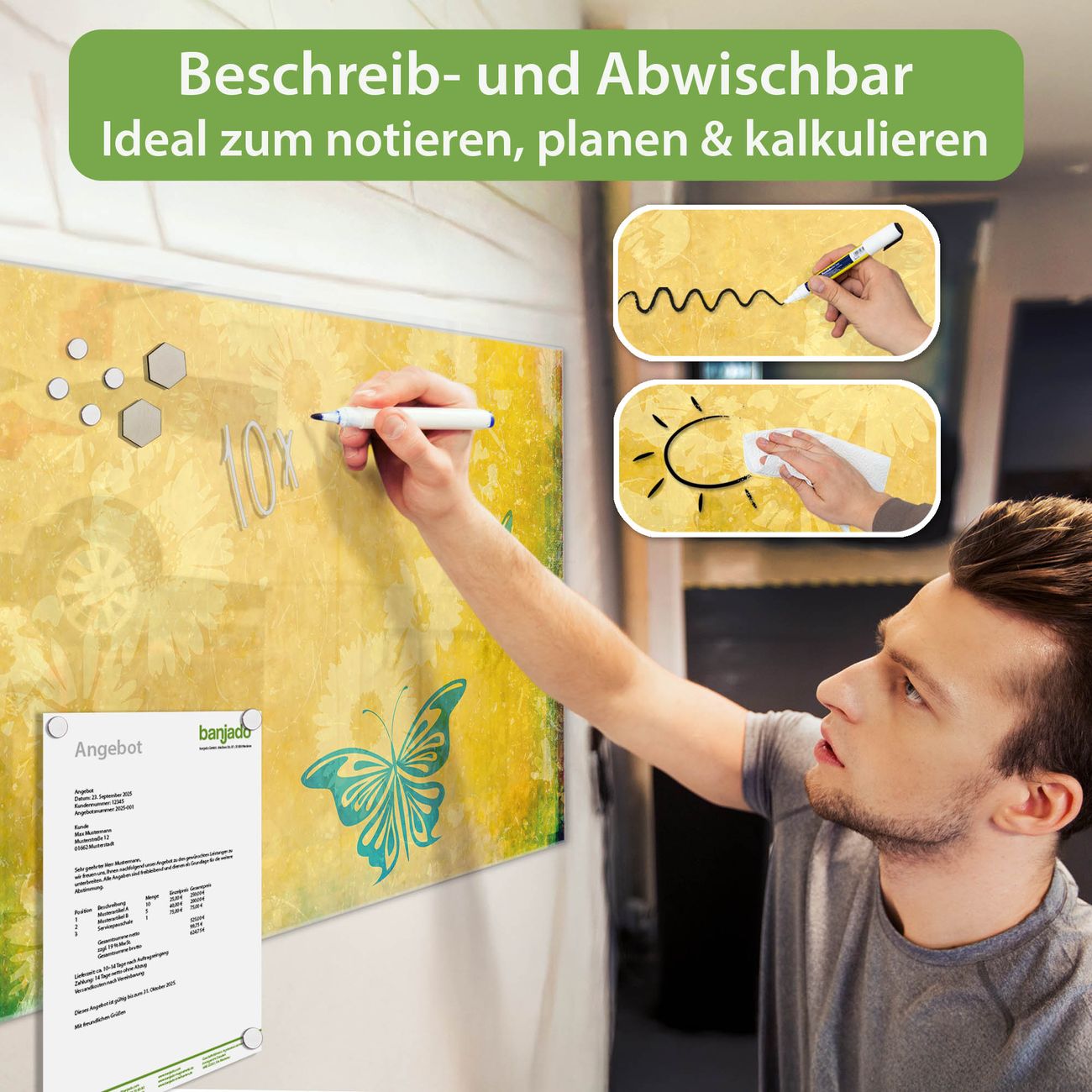 Material: 4mm Sicherheitsglas mit Metallrückwand Eigenschaften: beschreibbar, magnetisch, kratzfest Maße: 120x60x0,6cm, 10,80kg schwer Motiv Nummer 10365 Muster Sommer Zubehör: inklusive 4 Neodym-Magnete