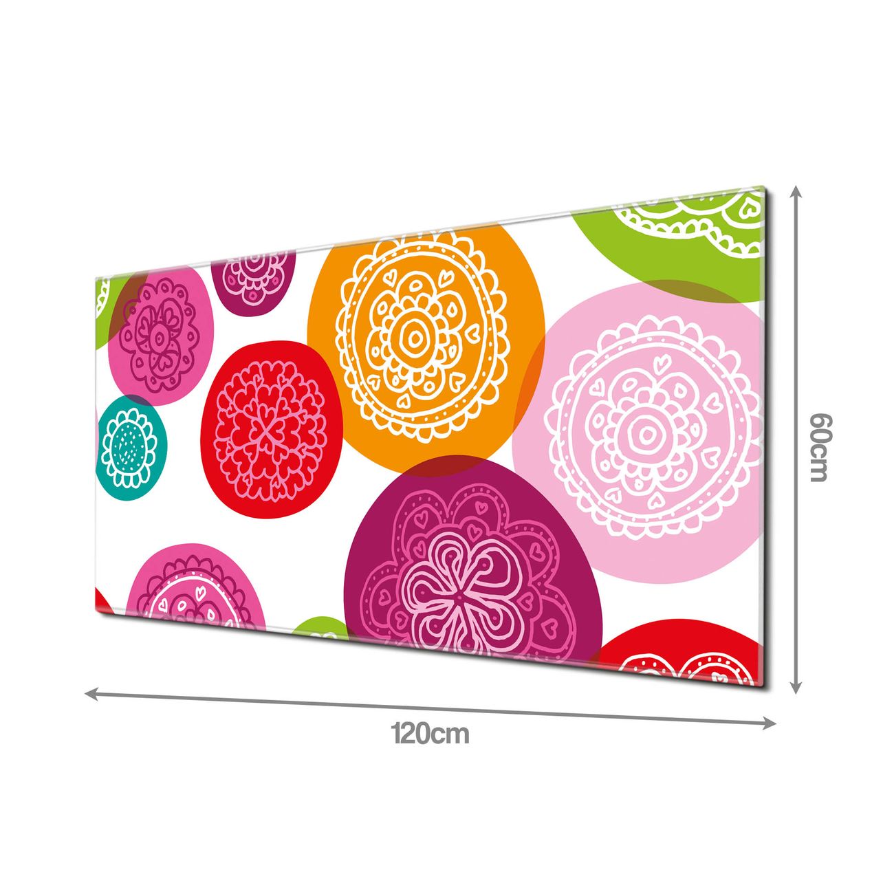 Material: 4mm Sicherheitsglas mit Metallrückwand Eigenschaften: beschreibbar, magnetisch, kratzfest Maße: 120x60x0,6cm, 10,80kg schwer Motiv Nummer 11419 Naive Blüten Zubehör: inklusive 4 Neodym-Magnete
