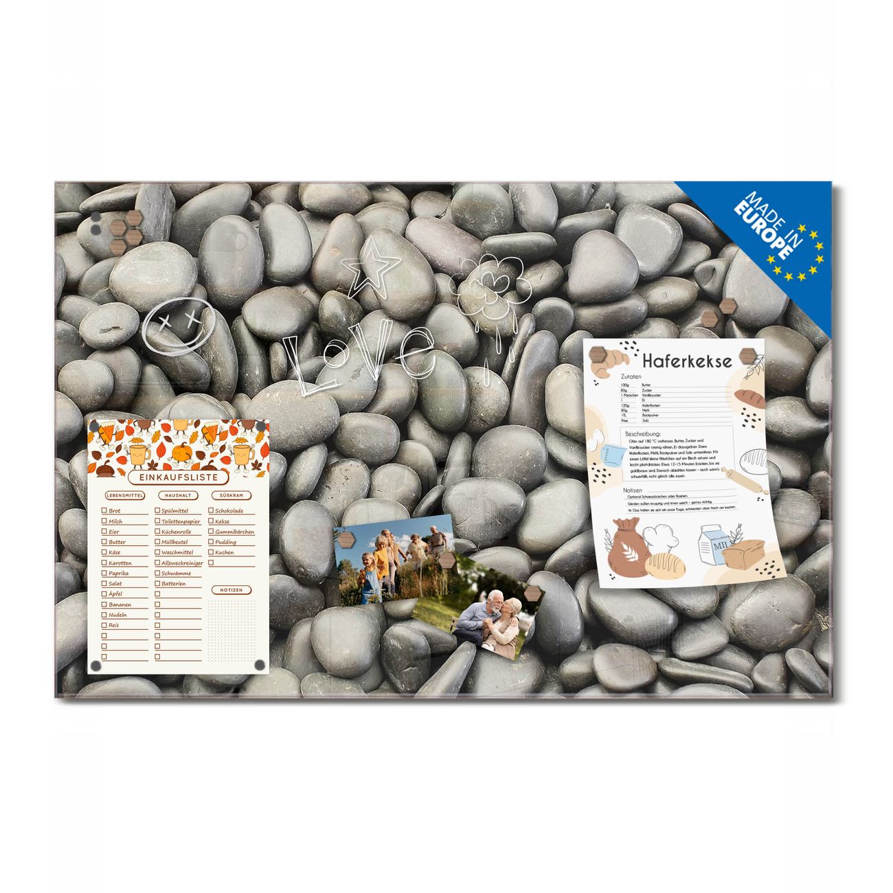 Ein Stück Design, das Ihren Alltag organisiert. Schreiben, heften, inspirieren - alles an einem Ort. Qualität, die man spürt. Montage leicht gemacht. Handwerk mit Herz - veredelt in Sachsen. Einzigartiges Design mit Motiv Motiv Nasse Kiesel Beschreibbare Glasoberfläche, leicht zu reinigen Starke Magnetkraft durch Stahlrückwand Inklusive 4 Neodym-Magneten Flexible Montageoptionen Handveredelt in Sachsen - Qualität, die bleibt