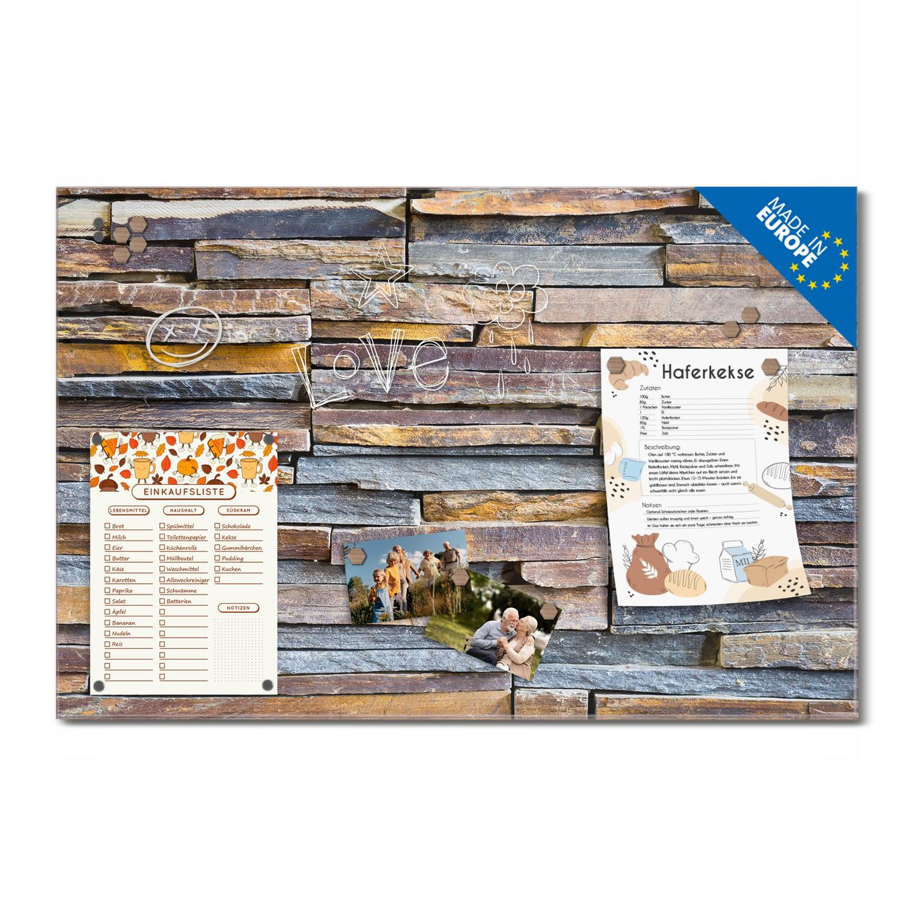 Ein Stück Design, das Ihren Alltag organisiert. Schreiben, heften, inspirieren - alles an einem Ort. Qualität, die man spürt. Montage leicht gemacht. Handwerk mit Herz - veredelt in Sachsen. Einzigartiges Design mit Motiv Motiv Naturstein Beschreibbare Glasoberfläche, leicht zu reinigen Starke Magnetkraft durch Stahlrückwand Inklusive 4 Neodym-Magneten Flexible Montageoptionen Handveredelt in Sachsen - Qualität, die bleibt