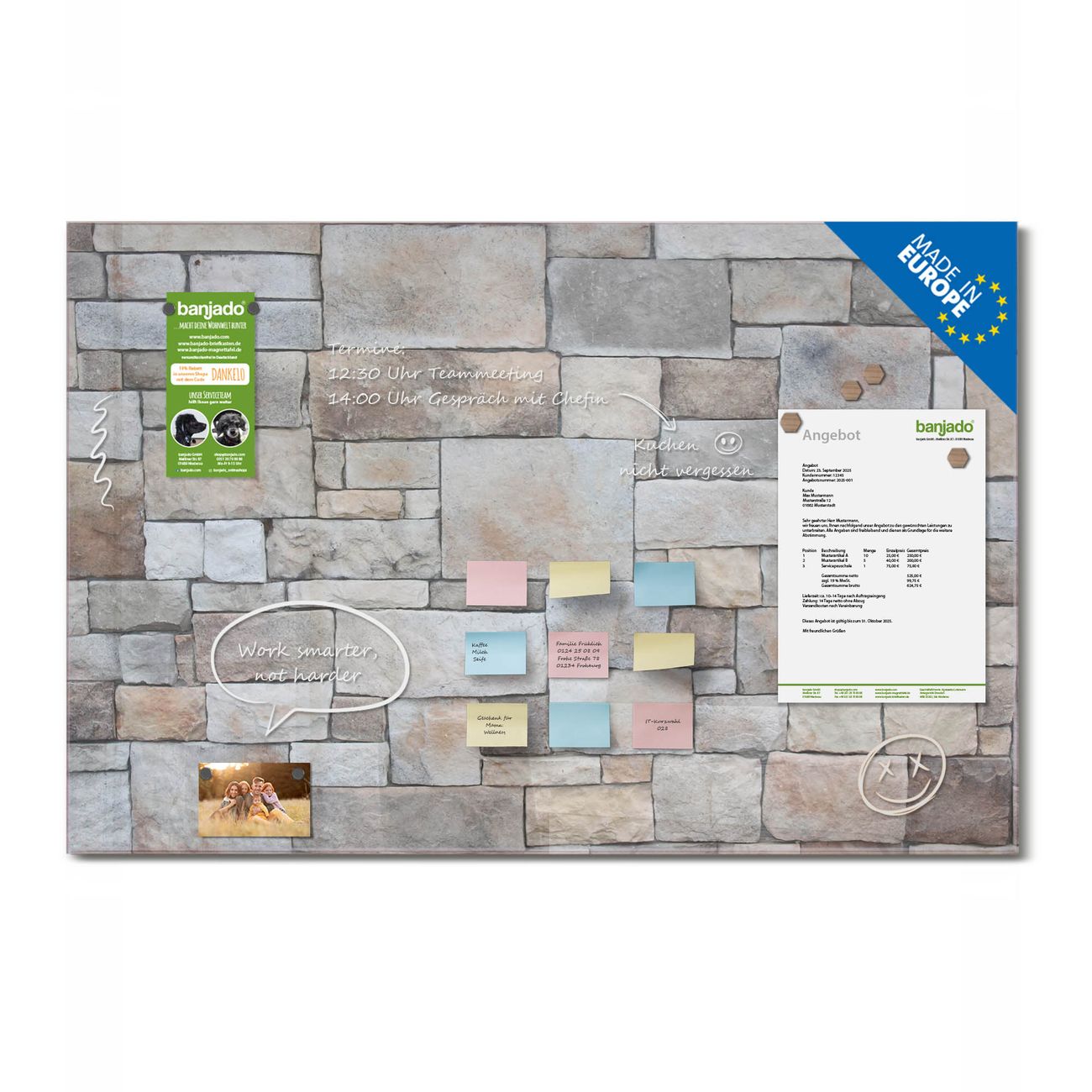 Jede Glas Magnettafel wird in unserer Werkstatt von Hand gefertigt und sorgfältig geprüft. So erhalten Sie ein echtes Qualitätsprodukt, das Funktion und Ästhetik perfekt vereint.?? Warum banjado?