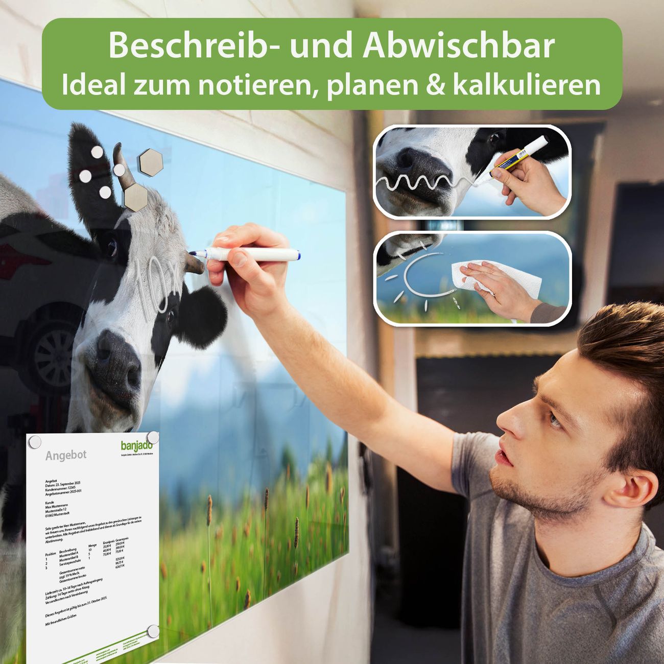 Bitte beachten Sie, dass ausschliessliche spezielle Magnete an der Glastafel haften. Wir empfehlen banjado Neodym Magnete, diese sind durch uns auf Wirksamkeit geprüft.