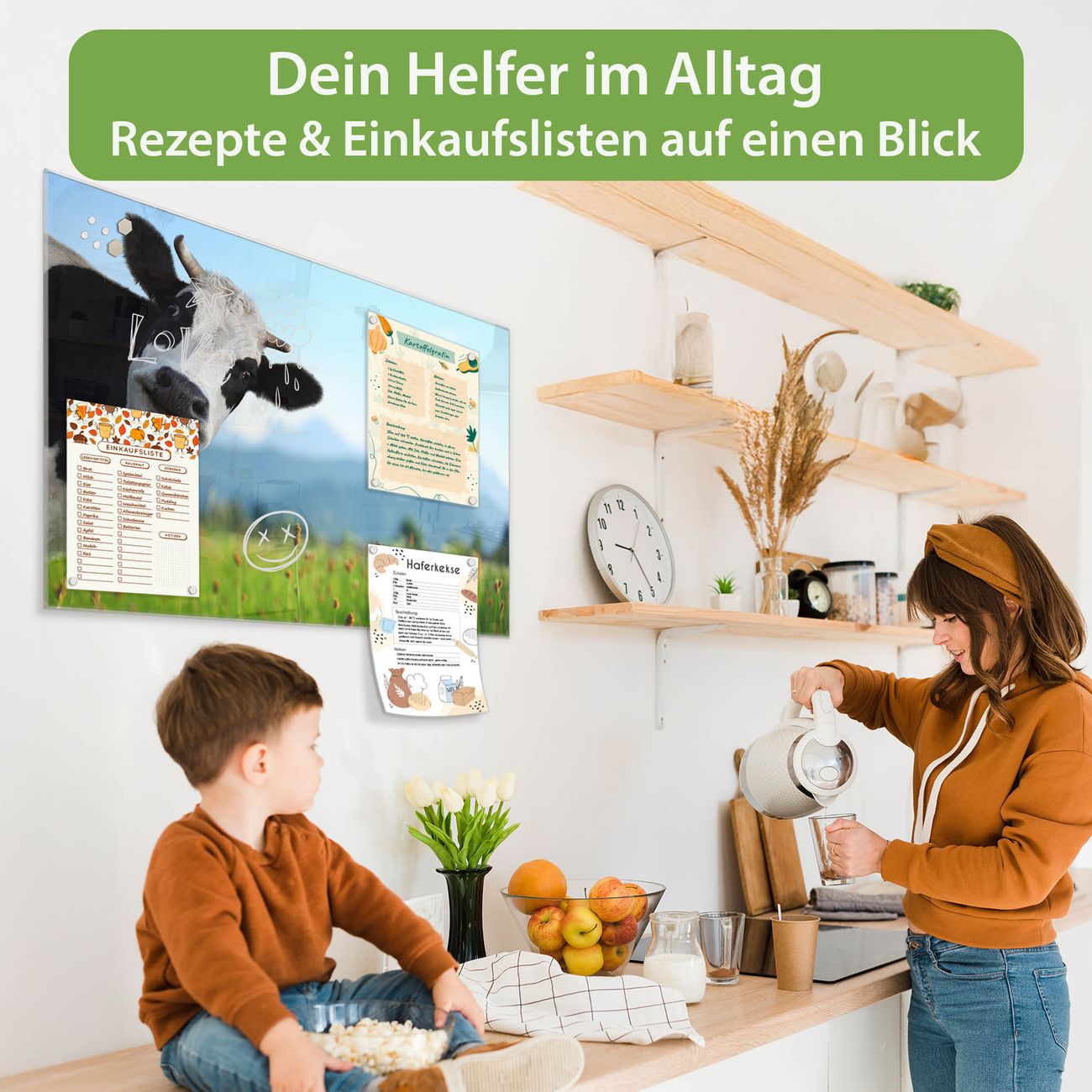 Auf der glatten Glasoberfläche lassen sich Termine, Rezepte oder Notizen ganz einfach mit Kreidestiften festhalten und rückstandslos entfernen. Starke Neodym-Magnete halten Ihre wichtigsten Erinnerungen sicher an Ort und Stelle. So entsteht Ihre ganz persönliche Ideenwand - jeden Tag neu.