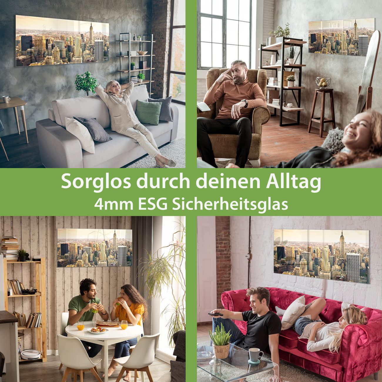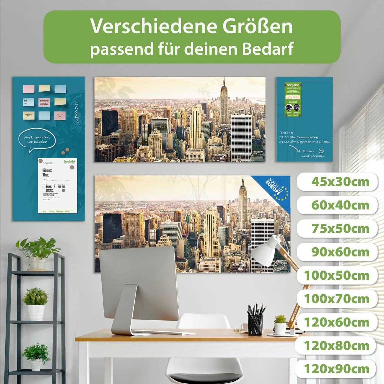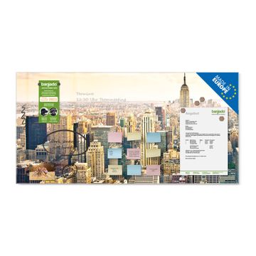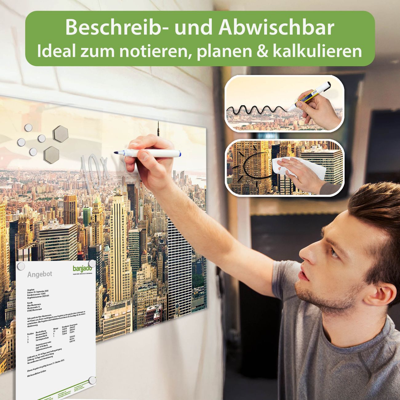 Material: 4mm Sicherheitsglas mit Metallrückwand Eigenschaften: beschreibbar, magnetisch, kratzfest Maße: 100x50x0,6cm, 7,50kg schwer Motiv Nummer 10238 New York City Zubehör: inklusive 4 Neodym-Magnete