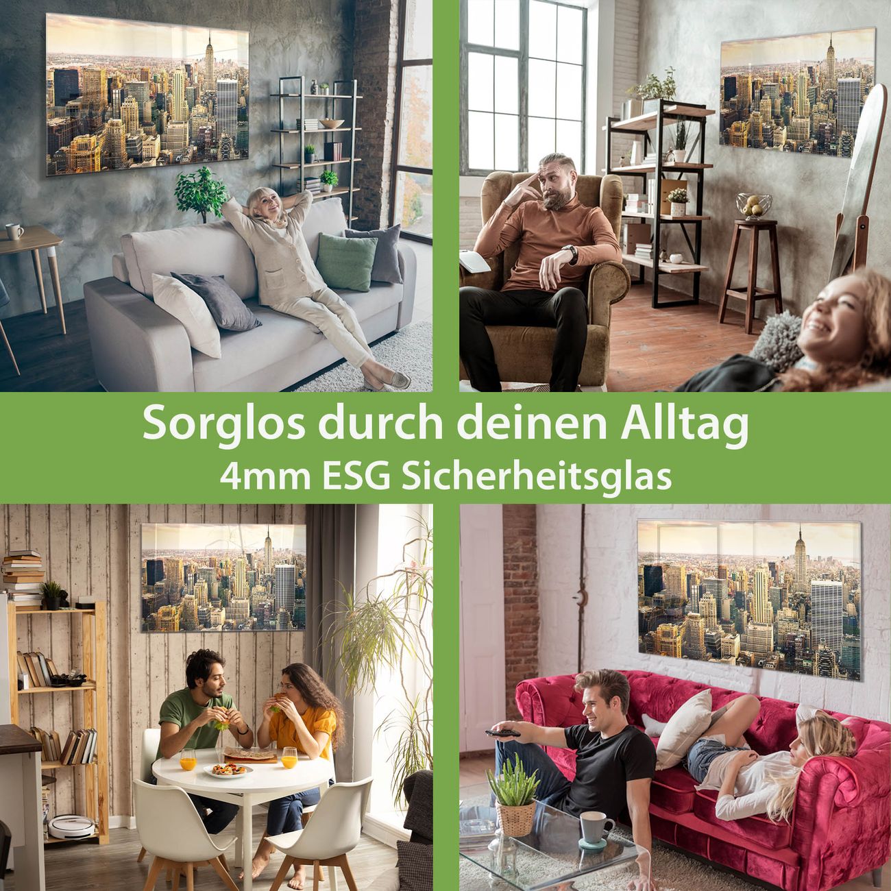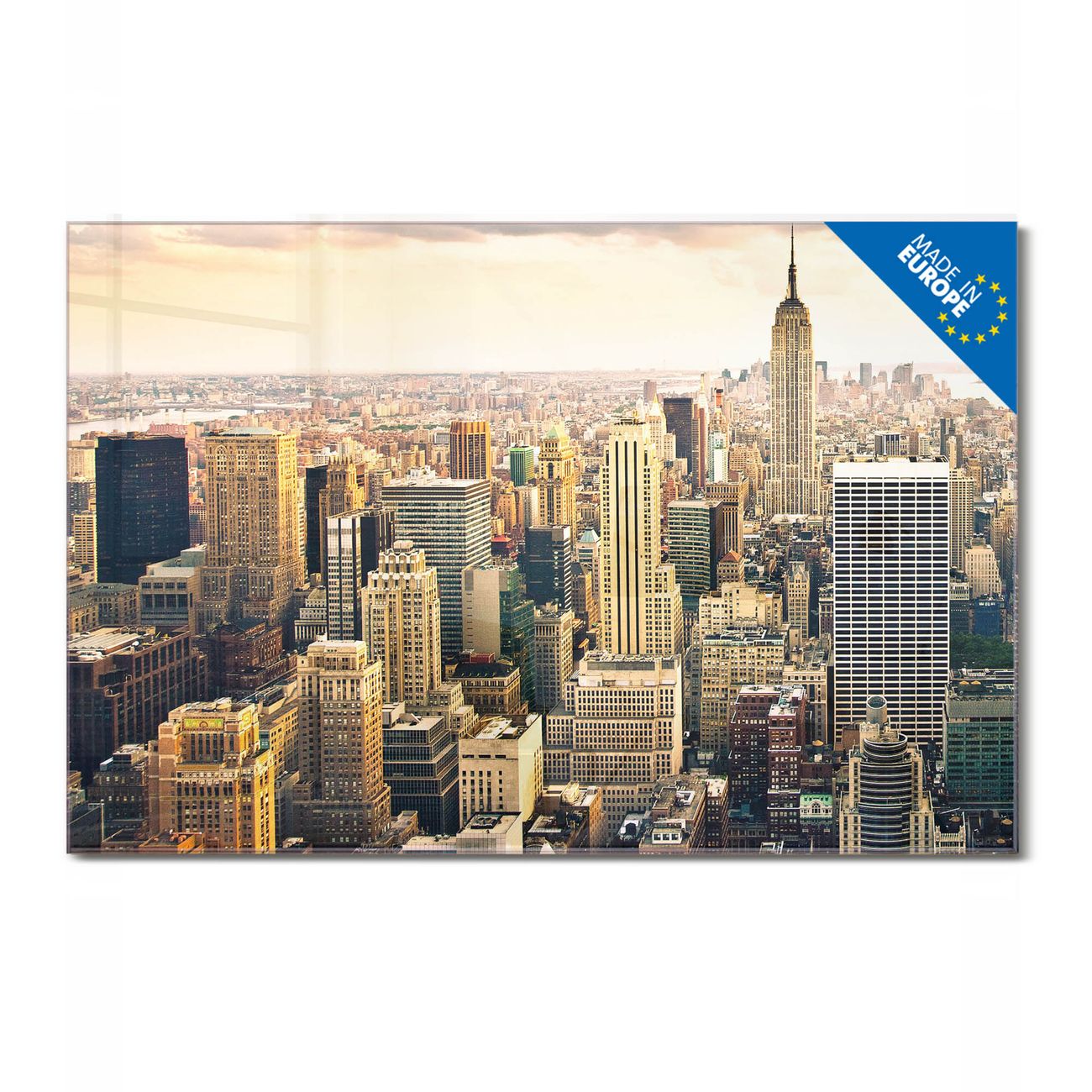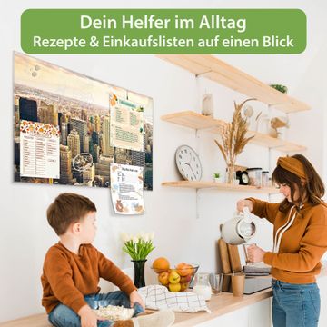 Material: 4mm Sicherheitsglas mit Metallrückwand Eigenschaften: beschreibbar, magnetisch, kratzfest Maße: 75x50x0,6cm, 5,63kg schwer Motiv Nummer 10238 New York City Zubehör: inklusive 4 Neodym-Magnete