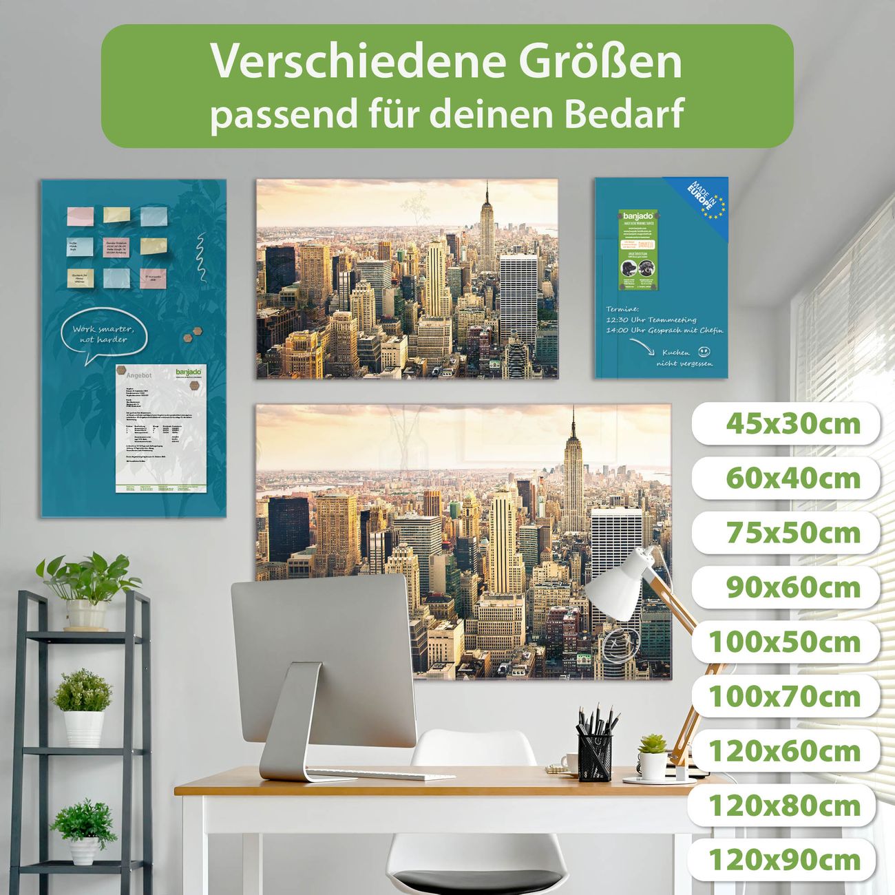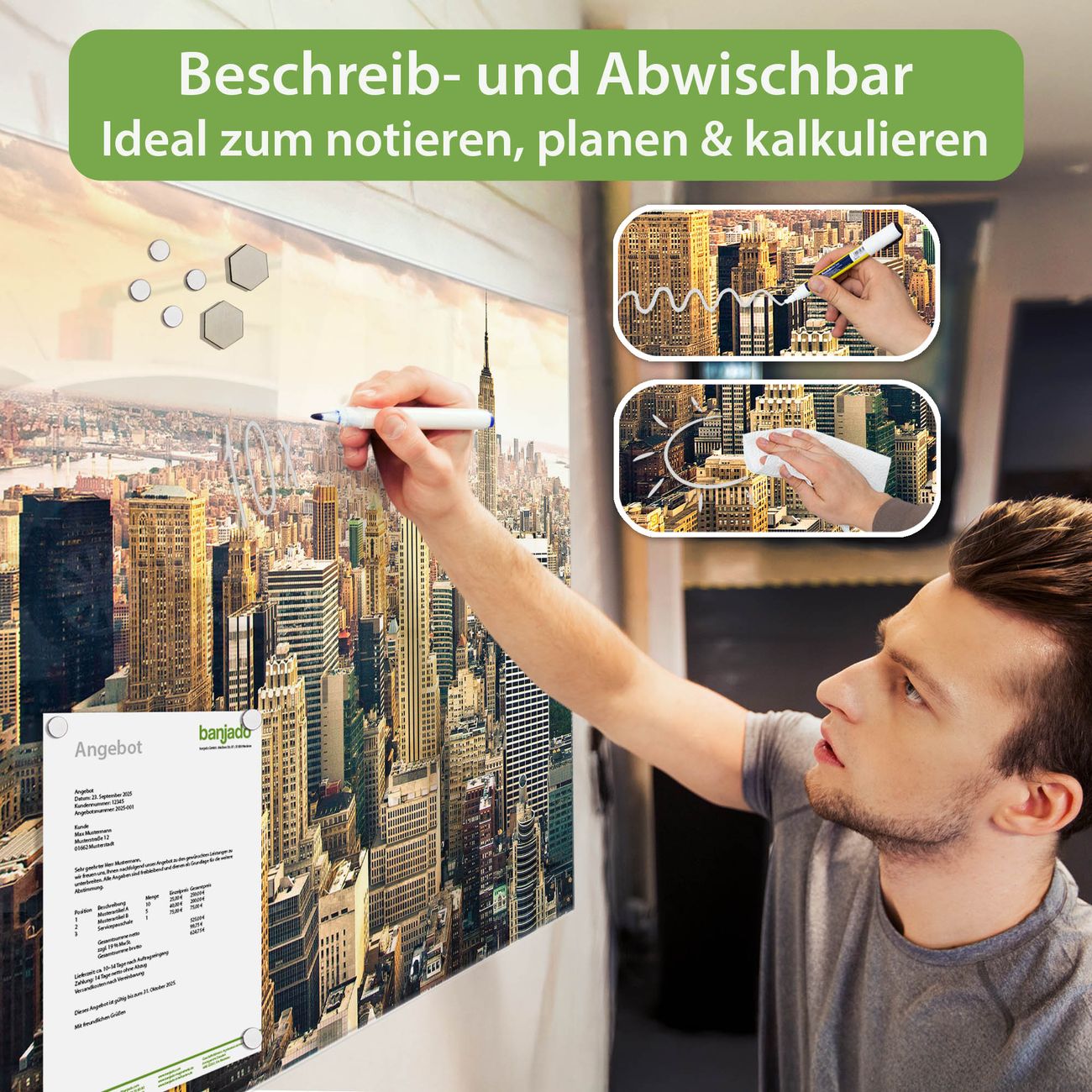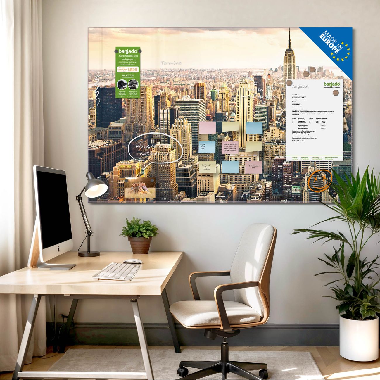 Jede Glas Magnettafel wird in unserer Werkstatt von Hand gefertigt und sorgfältig geprüft. So erhalten Sie ein echtes Qualitätsprodukt, das Funktion und Ästhetik perfekt vereint.?? Warum banjado?
