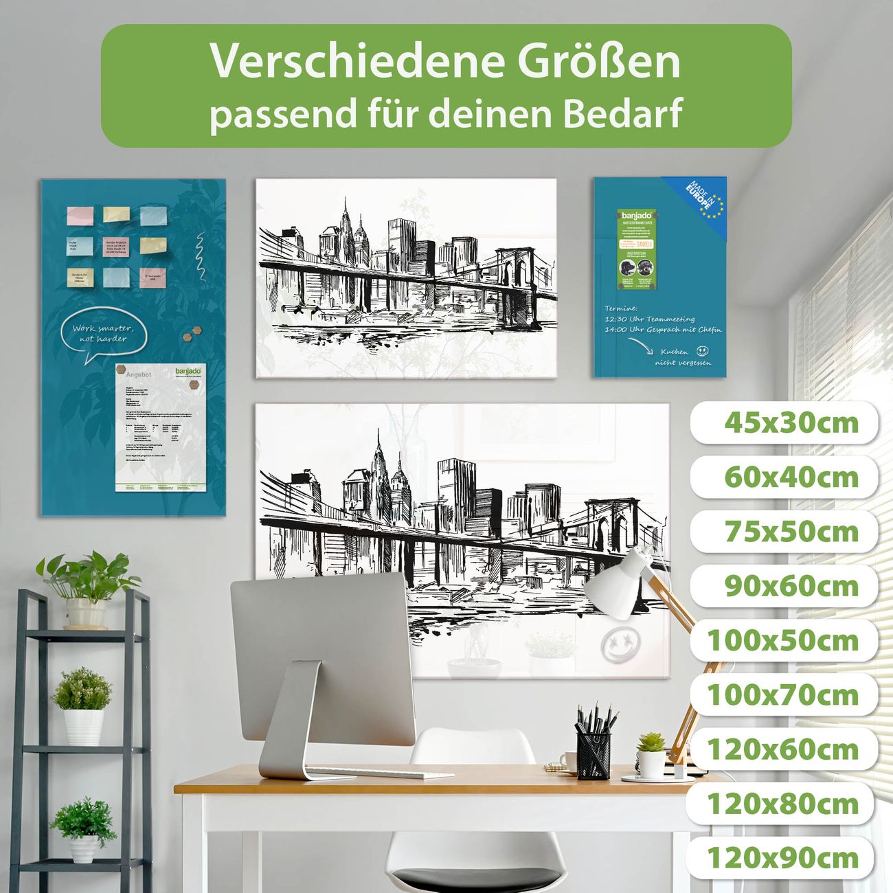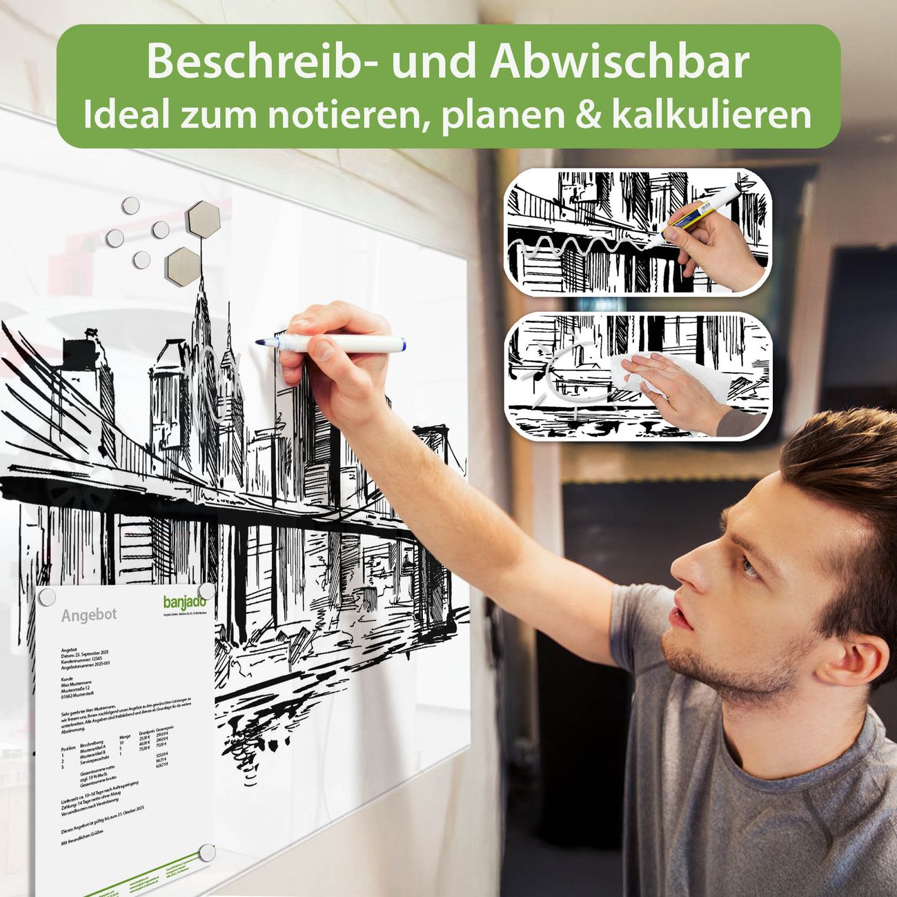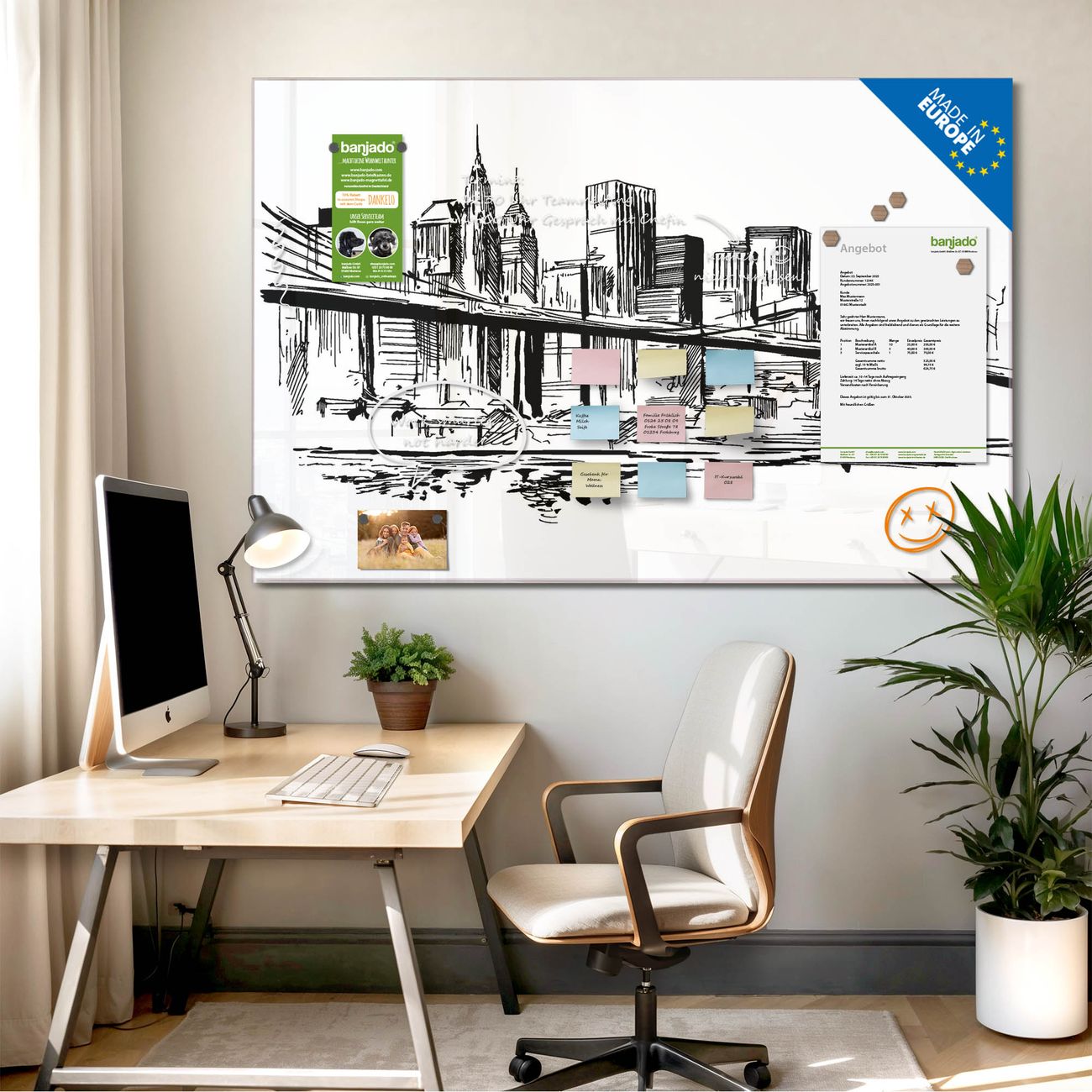 Jede Glas Magnettafel wird in unserer Werkstatt von Hand gefertigt und sorgfältig geprüft. So erhalten Sie ein echtes Qualitätsprodukt, das Funktion und Ästhetik perfekt vereint.?? Warum banjado?