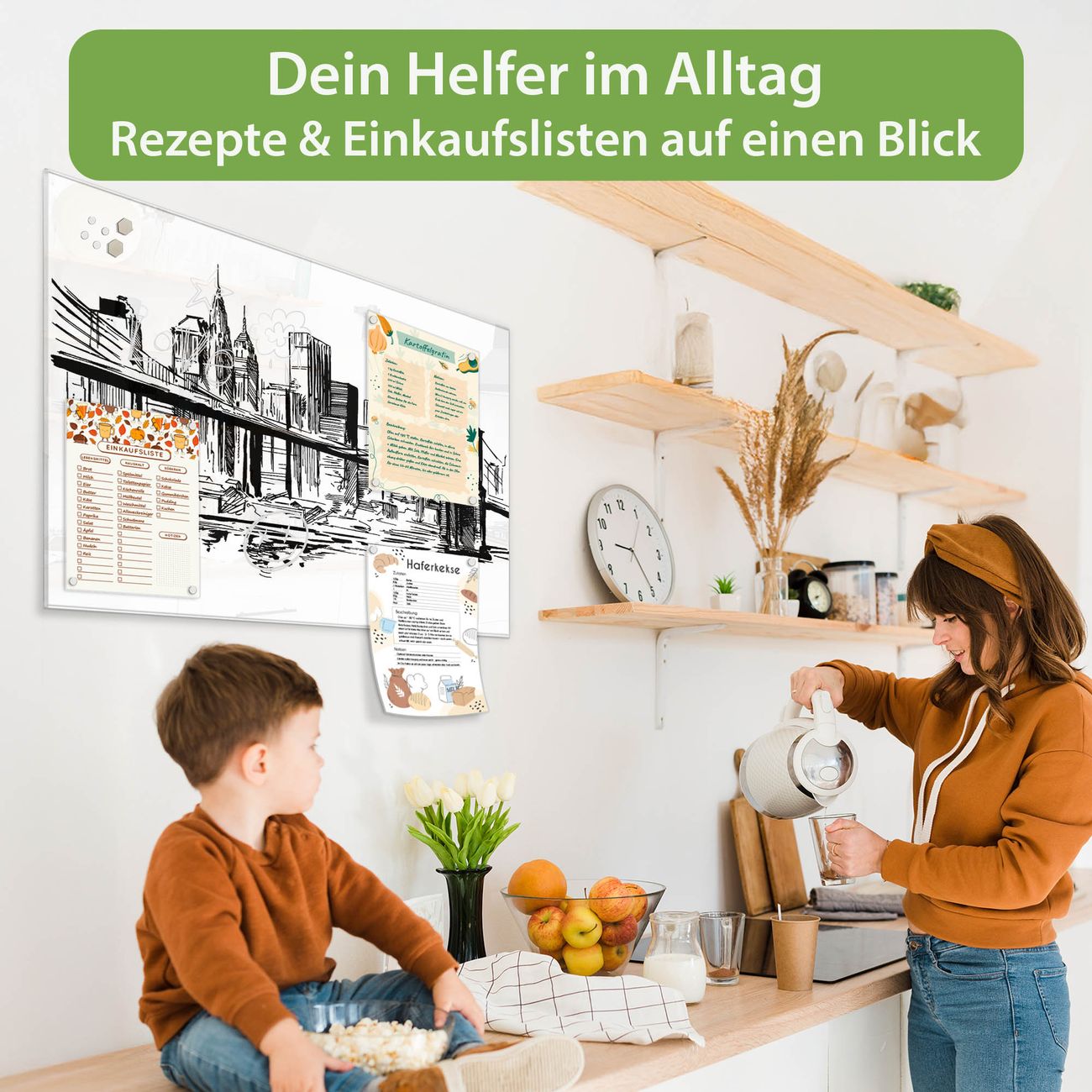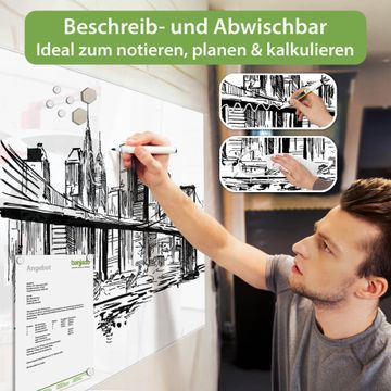 Auf der glatten Glasoberfläche lassen sich Termine, Rezepte oder Notizen ganz einfach mit Kreidestiften festhalten und rückstandslos entfernen. Starke Neodym-Magnete halten Ihre wichtigsten Erinnerungen sicher an Ort und Stelle. So entsteht Ihre ganz persönliche Ideenwand - jeden Tag neu.