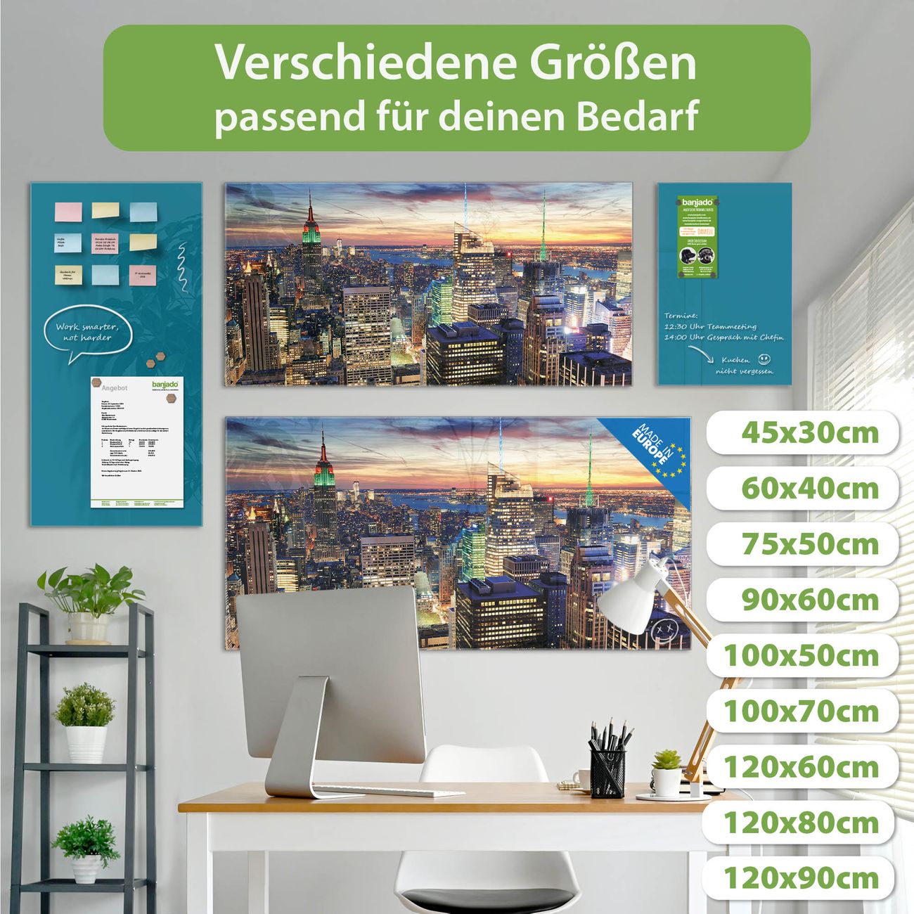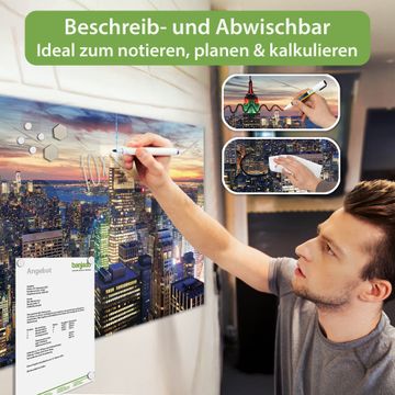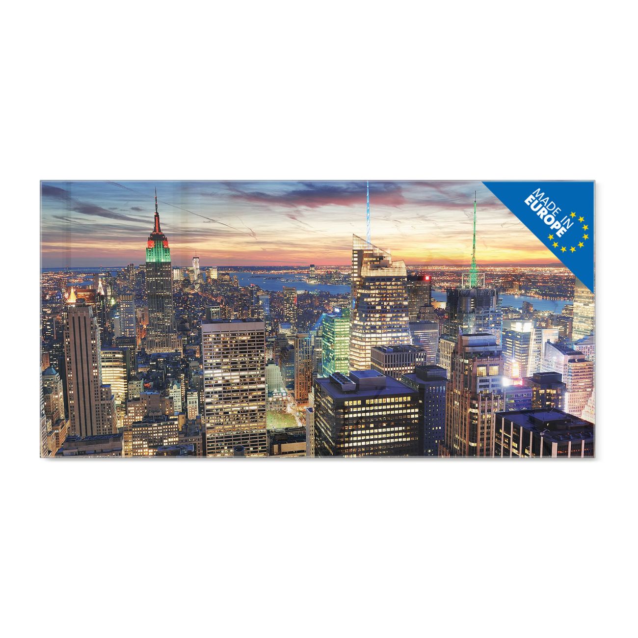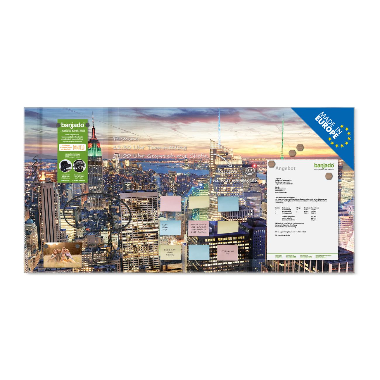 Material: 4mm Sicherheitsglas mit Metallrückwand Eigenschaften: beschreibbar, magnetisch, kratzfest Maße: 100x50x0,6cm, 7,50kg schwer Motiv Nummer 12409 New York Sunset Zubehör: inklusive 4 Neodym-Magnete