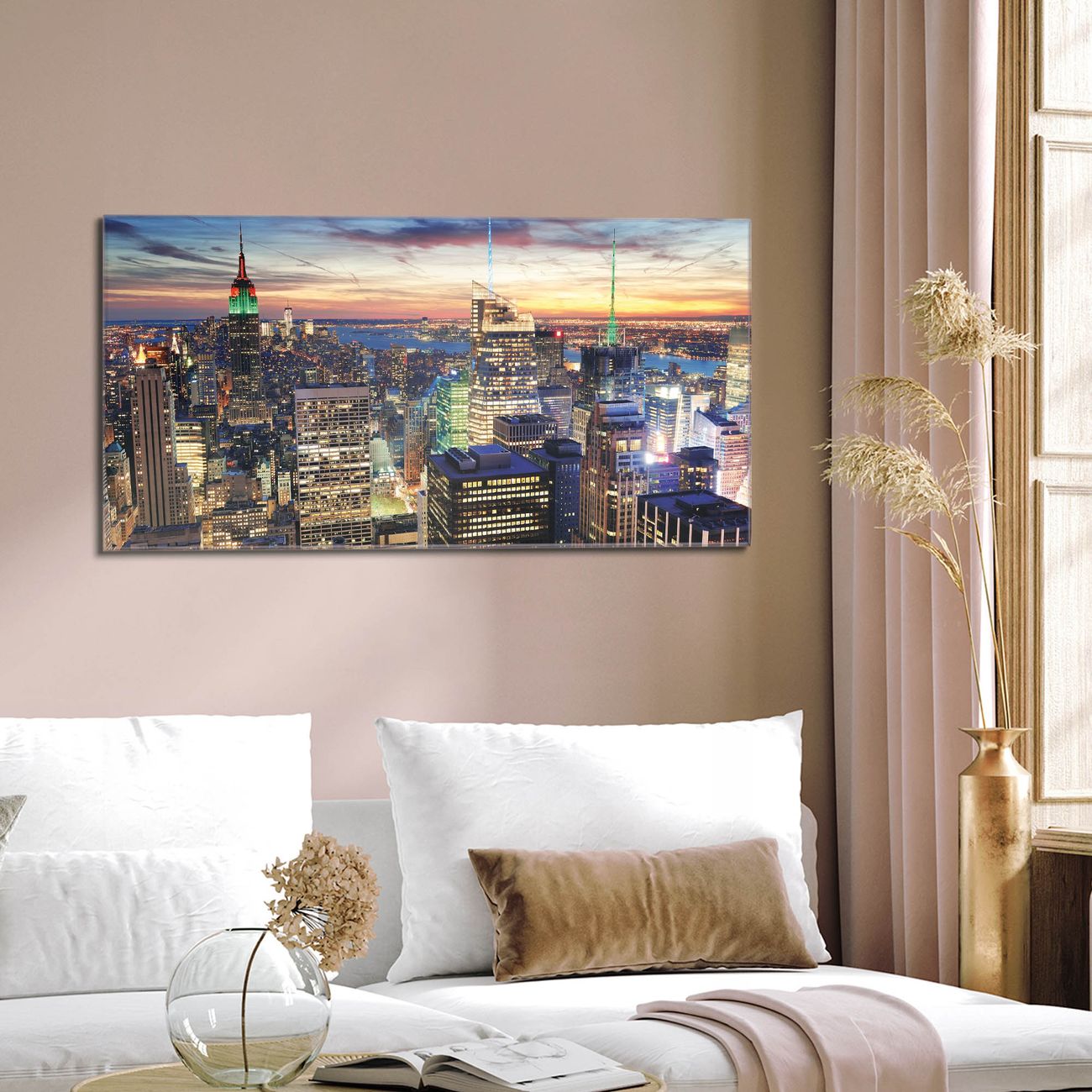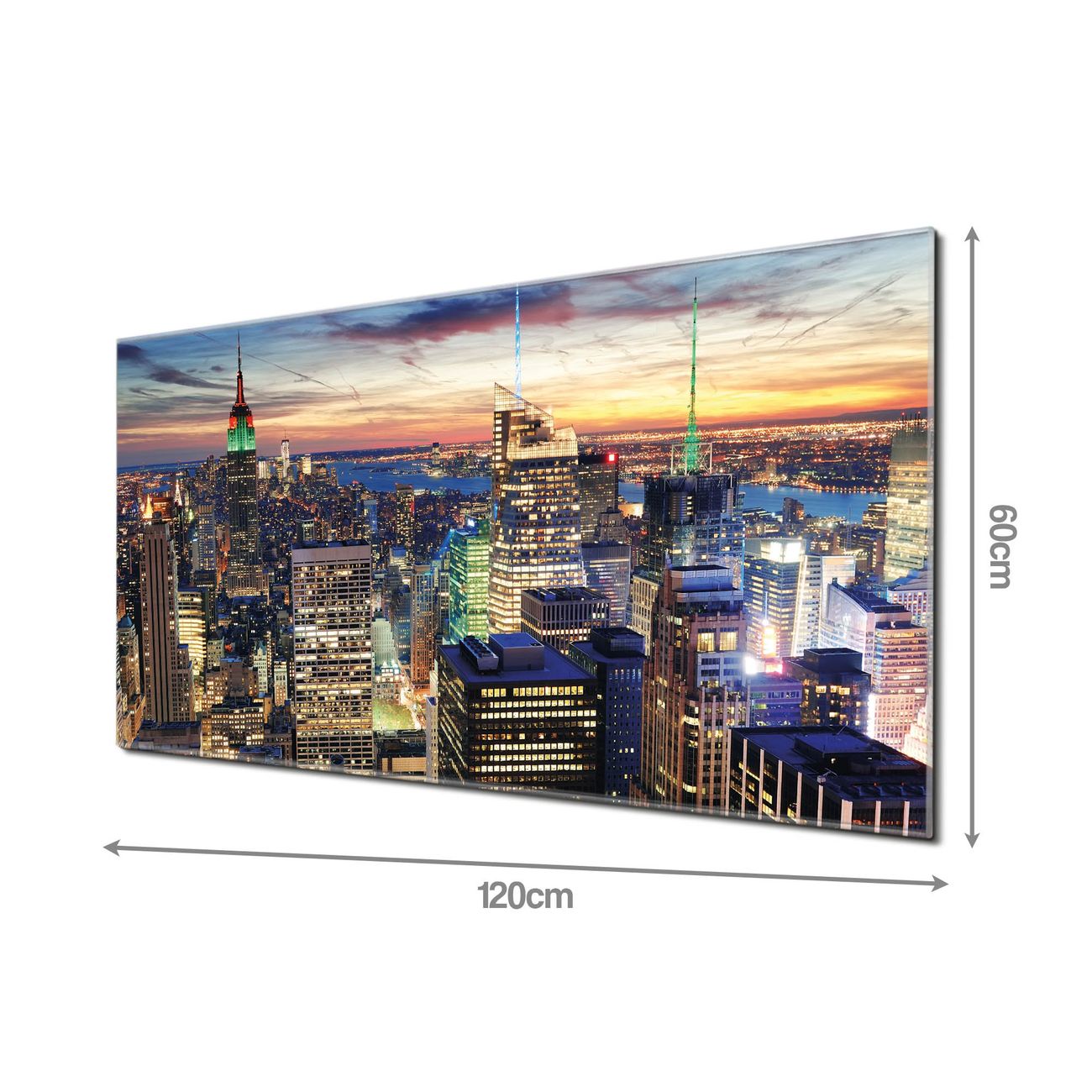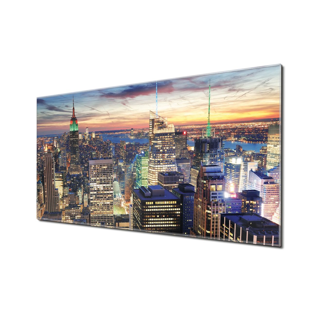 Material: 4mm Sicherheitsglas mit Metallrückwand Eigenschaften: beschreibbar, magnetisch, kratzfest Maße: 120x60x0,6cm, 10,80kg schwer Motiv Nummer 12409 New York Sunset Zubehör: inklusive 4 Neodym-Magnete