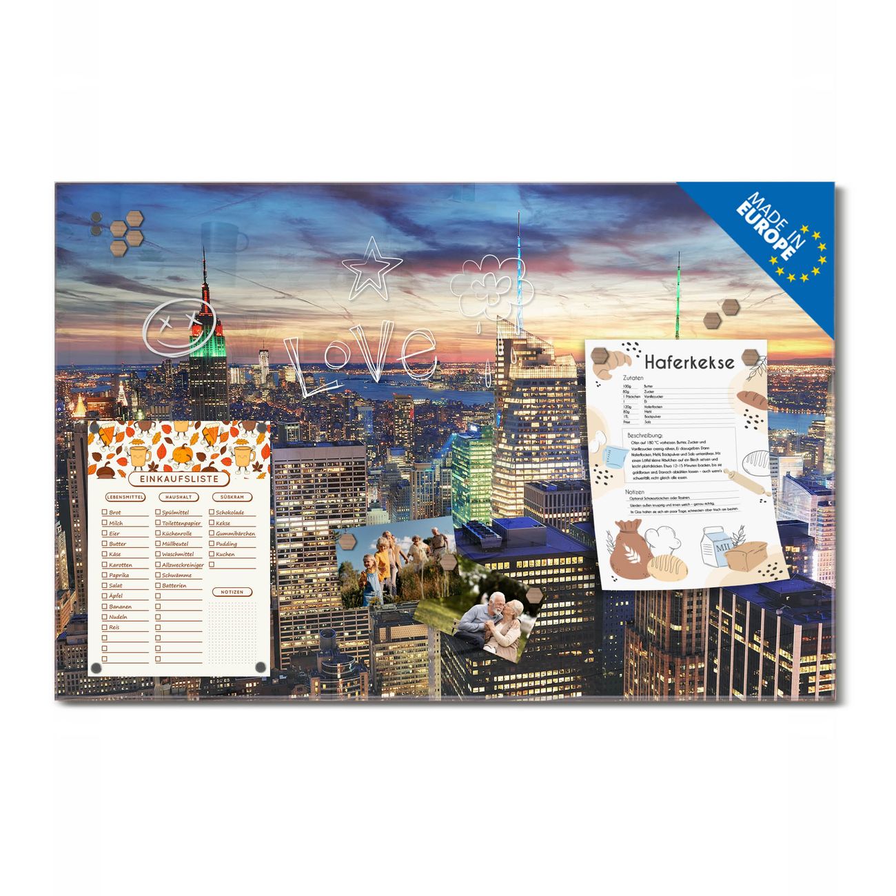 Material: 4mm Sicherheitsglas mit Metallrückwand Eigenschaften: beschreibbar, magnetisch, kratzfest Maße: 45x30x0,6cm, 2,03kg schwer Motiv Nummer 12409 New York Sunset Zubehör: inklusive 4 Neodym-Magnete