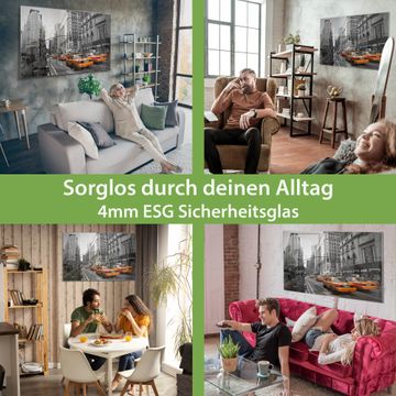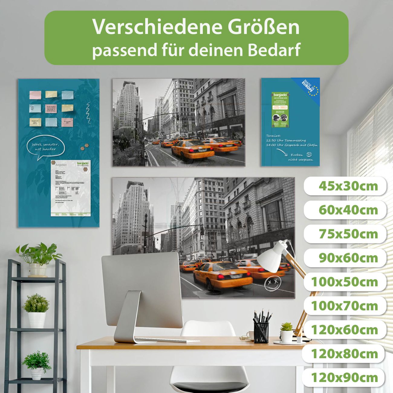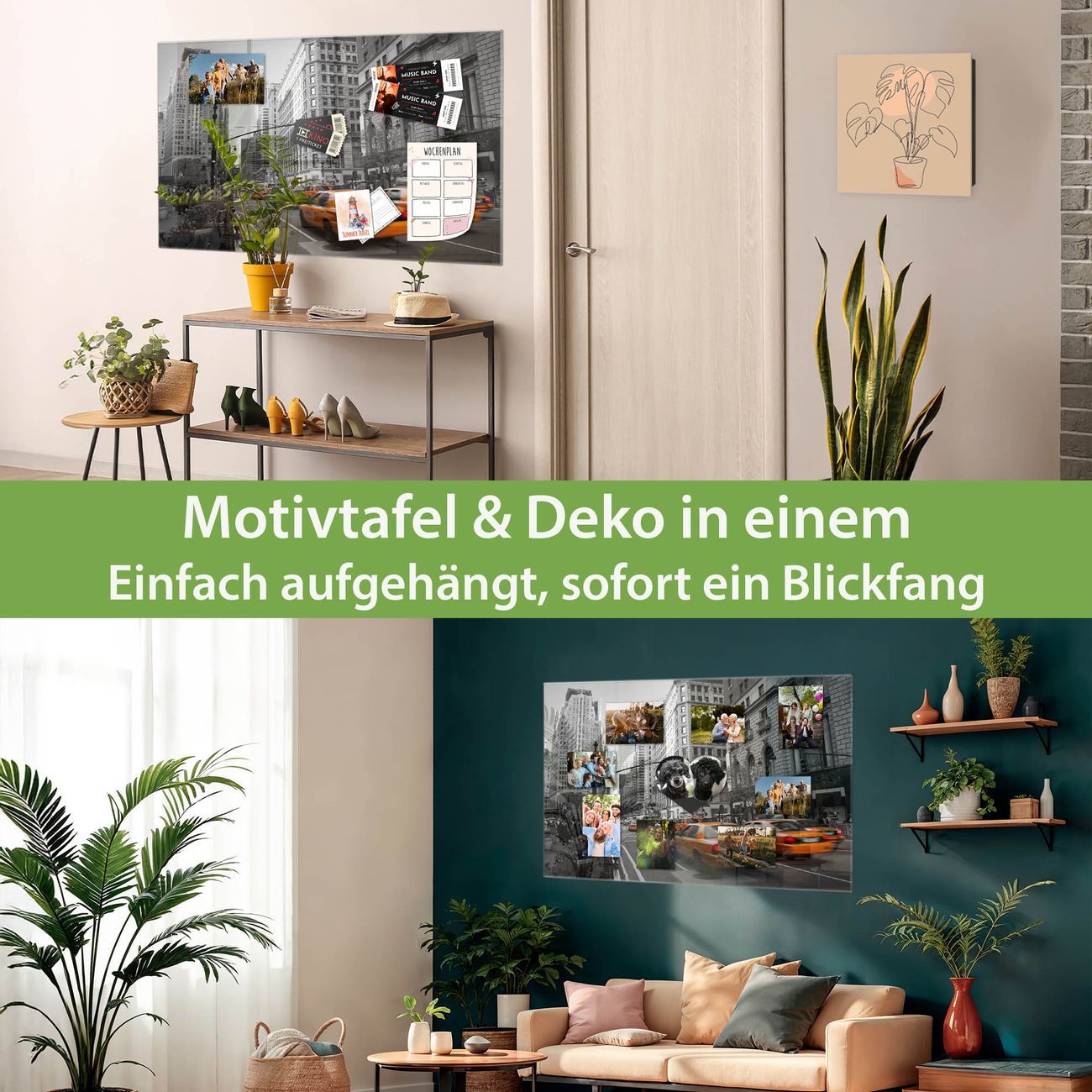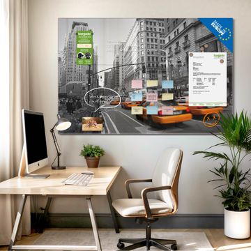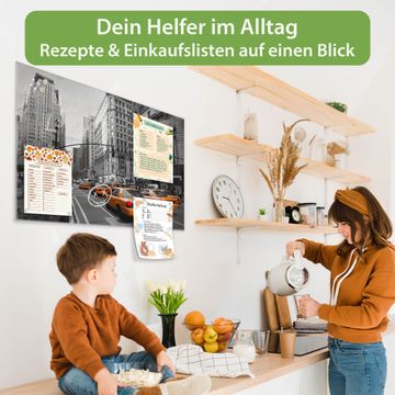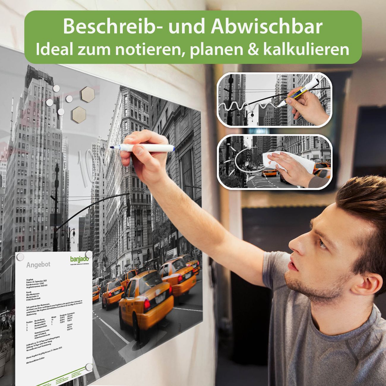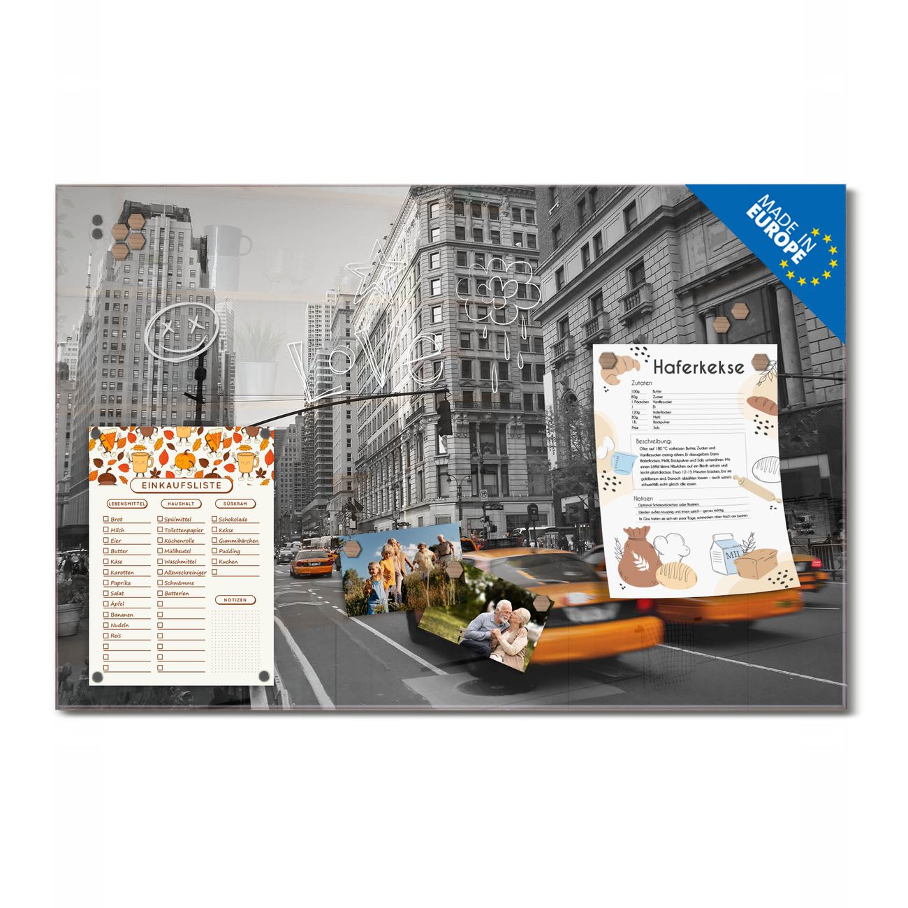 Material: 4mm Sicherheitsglas mit Metallrückwand Eigenschaften: beschreibbar, magnetisch, kratzfest Maße: 75x50x0,6cm, 5,63kg schwer Motiv Nummer 10076 New York Taxi Zubehör: inklusive 4 Neodym-Magnete