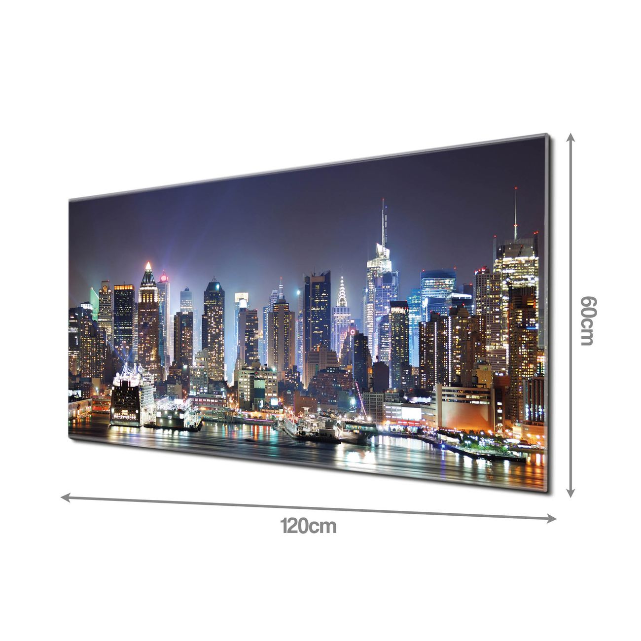 Material: 4mm Sicherheitsglas mit Metallrückwand Eigenschaften: beschreibbar, magnetisch, kratzfest Maße: 120x60x0,6cm, 10,80kg schwer Motiv Nummer 10019 New York Zubehör: inklusive 4 Neodym-Magnete