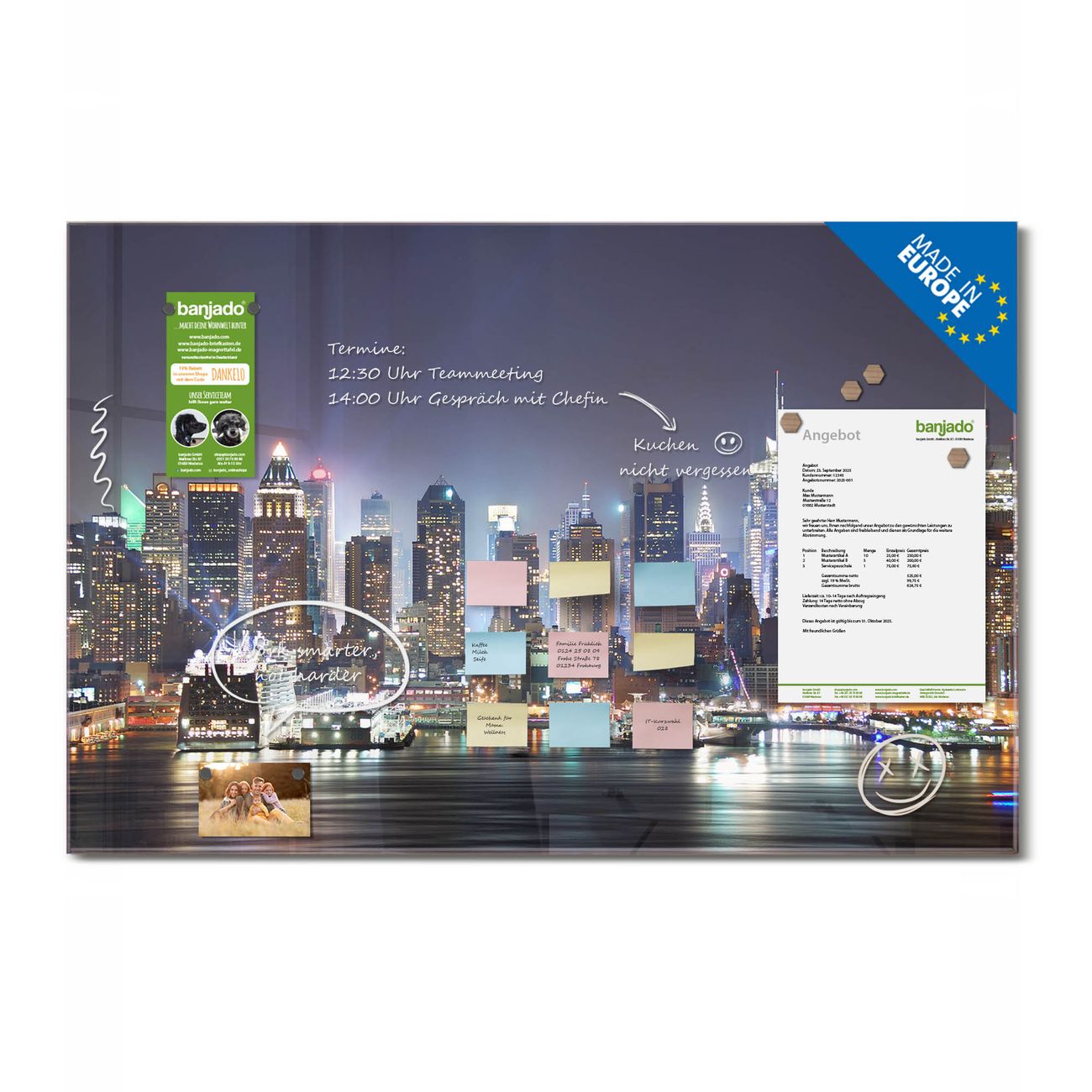 Material: 4mm Sicherheitsglas mit Metallrückwand Eigenschaften: beschreibbar, magnetisch, kratzfest Maße: 120x80x0,6cm, 14,40kg schwer Motiv Nummer 10019 New York Zubehör: inklusive 4 Neodym-Magnete