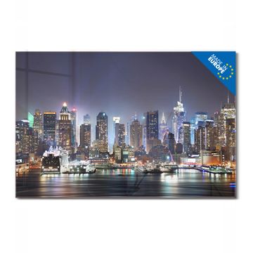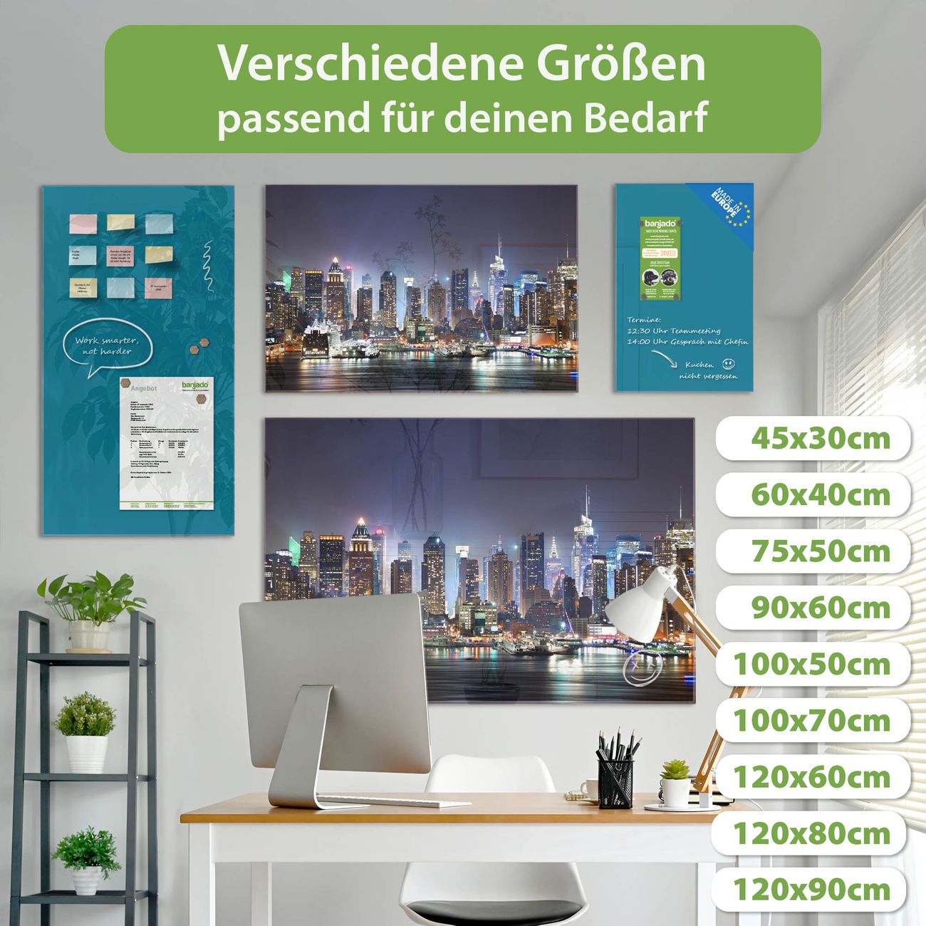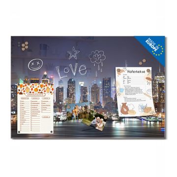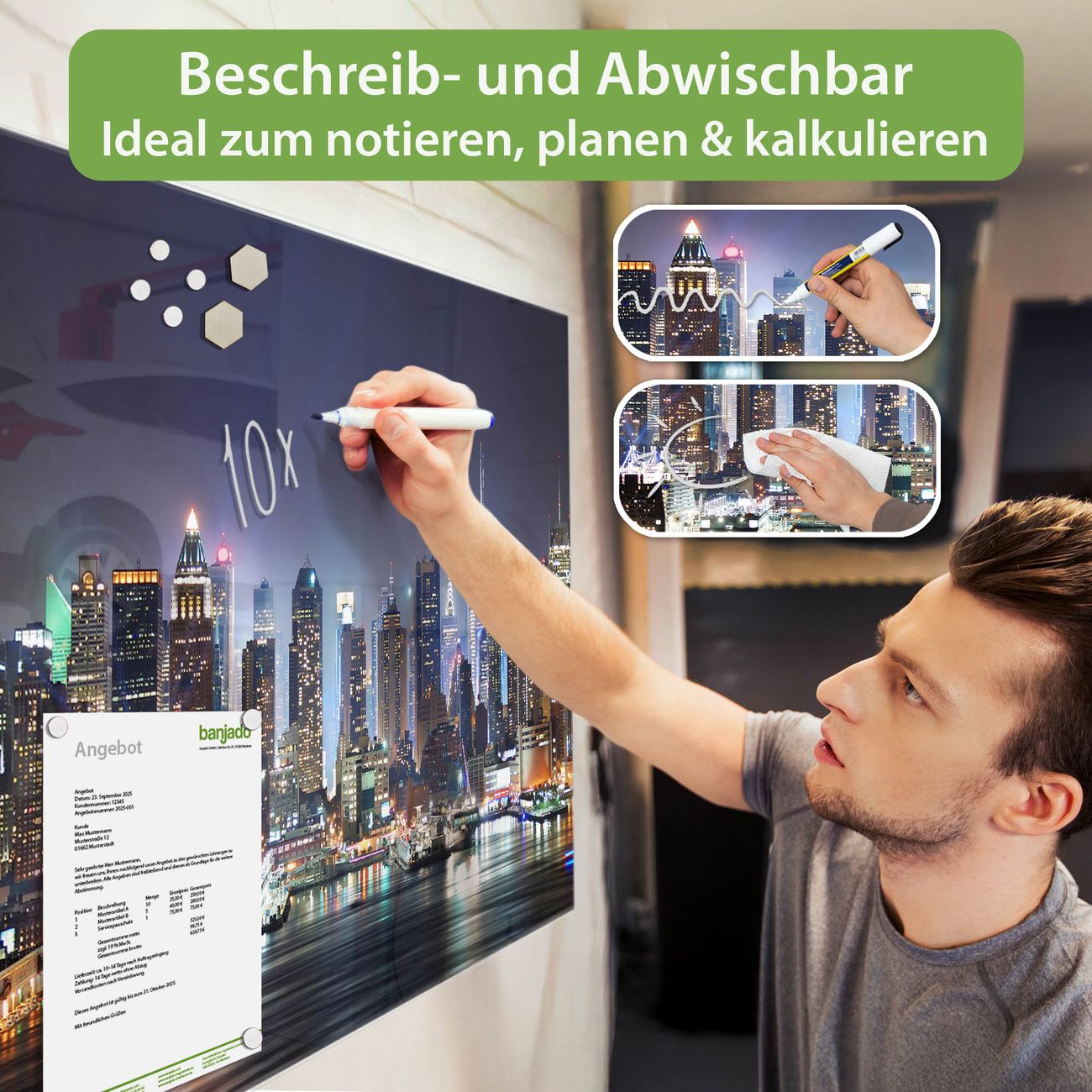 Material: 4mm Sicherheitsglas mit Metallrückwand Eigenschaften: beschreibbar, magnetisch, kratzfest Maße: 45x30x0,6cm, 2,03kg schwer Motiv Nummer 10019 New York Zubehör: inklusive 4 Neodym-Magnete