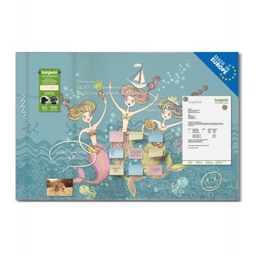 Material: 4mm Sicherheitsglas mit Metallrückwand Eigenschaften: beschreibbar, magnetisch, kratzfest Maße: 120x80x0,6cm, 14,40kg schwer Motiv Nummer 12229 Nixen Zubehör: inklusive 4 Neodym-Magnete