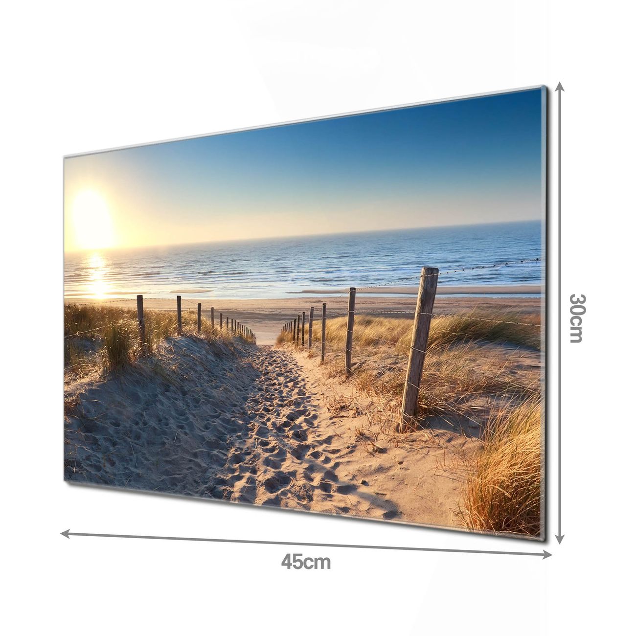 Material: 4mm Sicherheitsglas mit Metallrückwand Eigenschaften: beschreibbar, magnetisch, kratzfest Maße: 45x30x0,6cm, 2,03kg schwer Motiv Nummer 11121 Nordseestrand Zubehör: inklusive 4 Neodym-Magnete