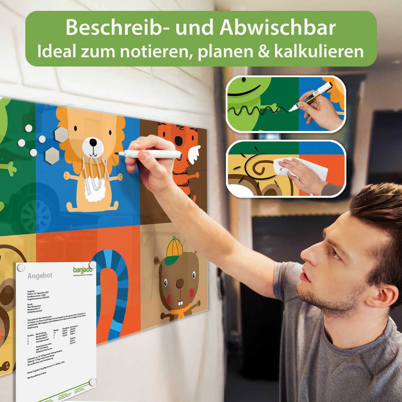 Bitte beachten Sie, dass ausschliessliche spezielle Magnete an der Glastafel haften. Wir empfehlen banjado Neodym Magnete, diese sind durch uns auf Wirksamkeit geprüft.