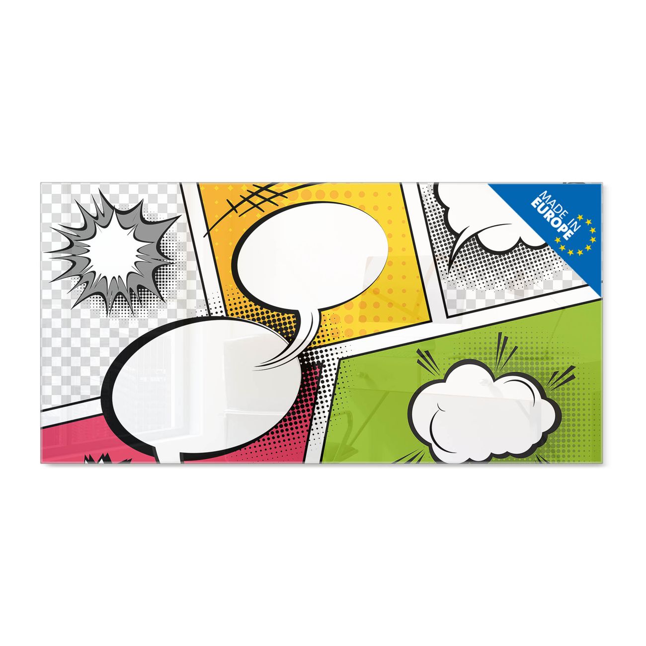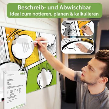 Material: 4mm Sicherheitsglas mit Metallrückwand Eigenschaften: beschreibbar, magnetisch, kratzfest Maße: 120x60x0,6cm, 10,80kg schwer Motiv Nummer 10743 Ohne Worte Zubehör: inklusive 4 Neodym-Magnete
