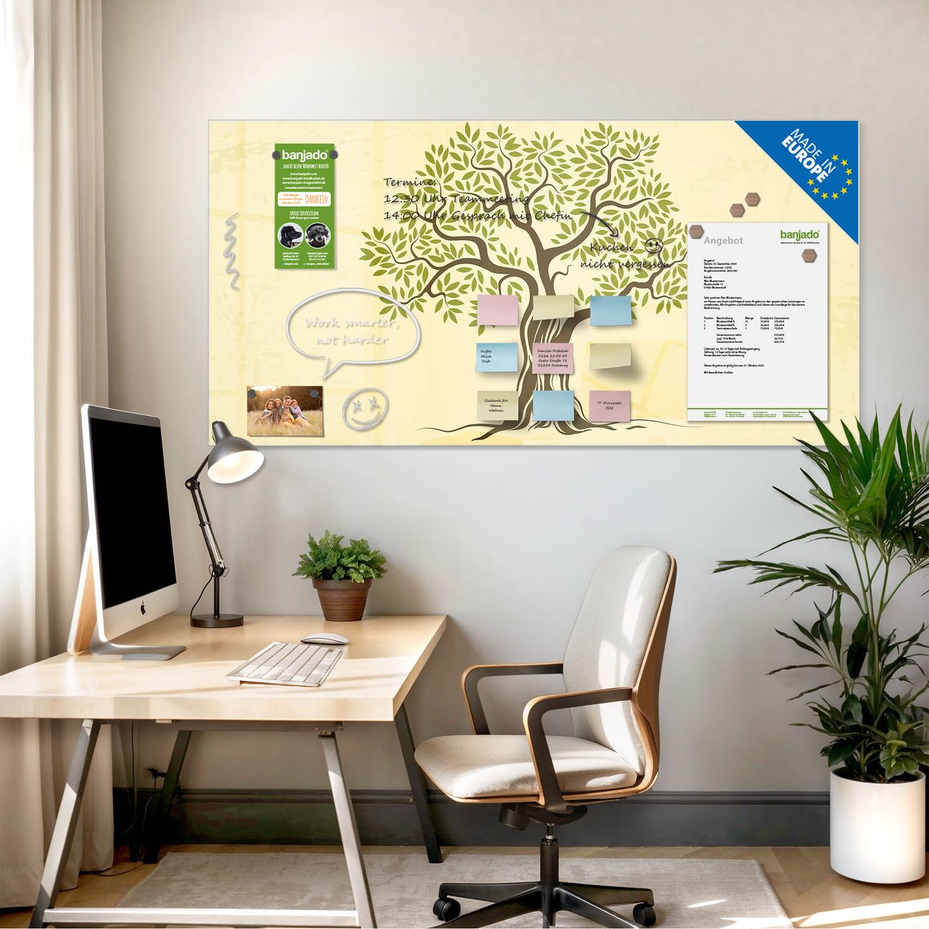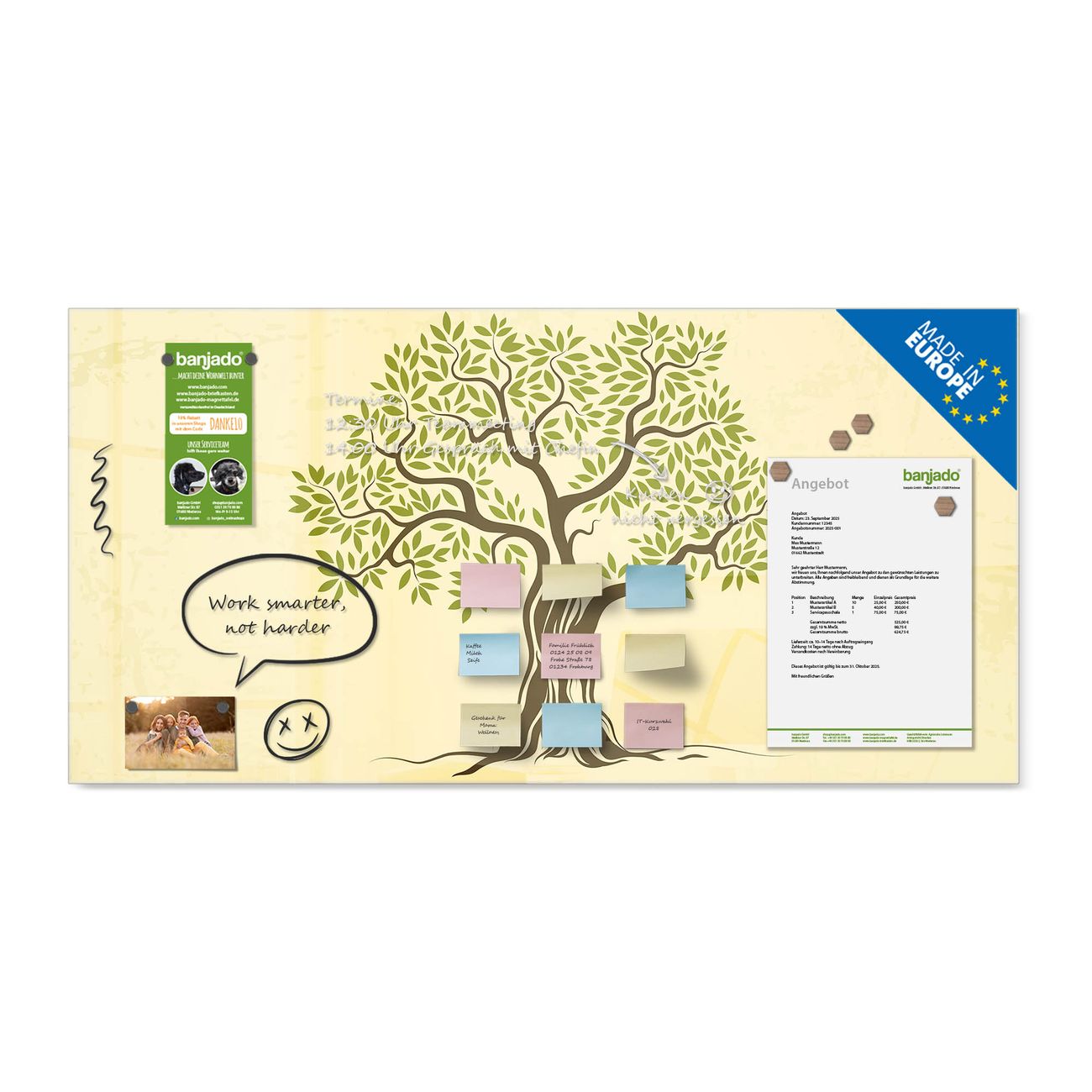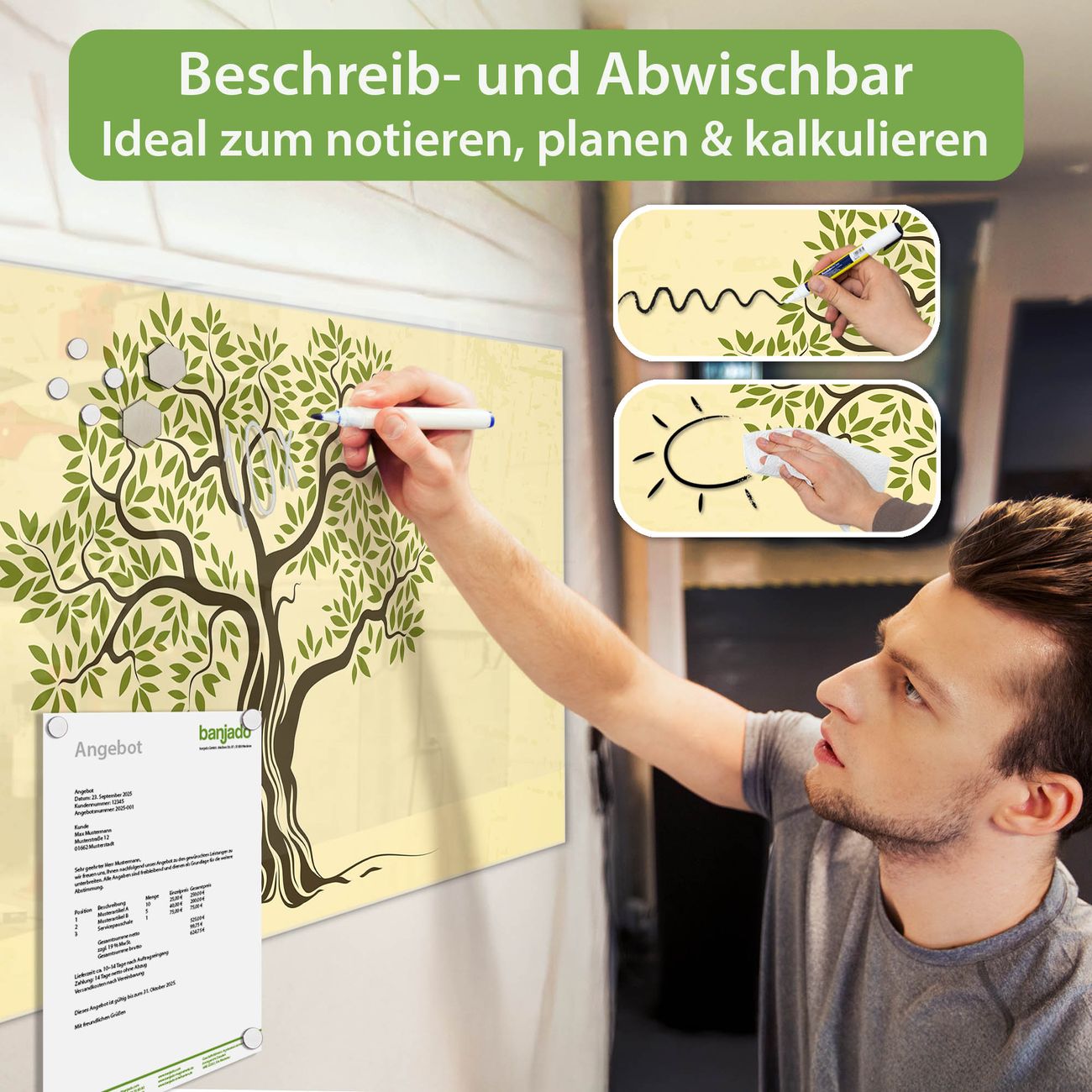 Material: 4mm Sicherheitsglas mit Metallrückwand Eigenschaften: beschreibbar, magnetisch, kratzfest Maße: 100x50x0,6cm, 7,50kg schwer Motiv Nummer 11129 Olivenbaum Zubehör: inklusive 4 Neodym-Magnete