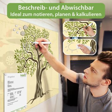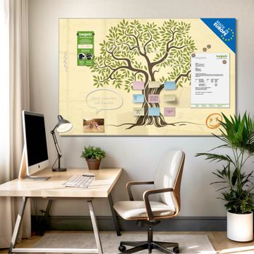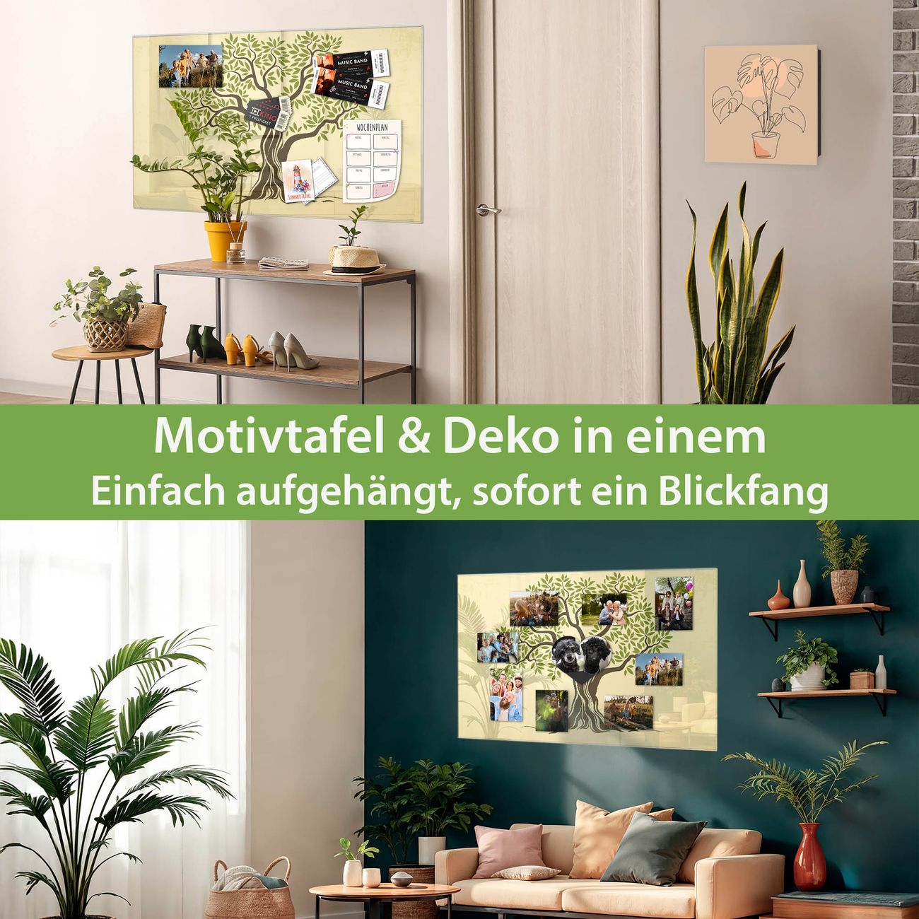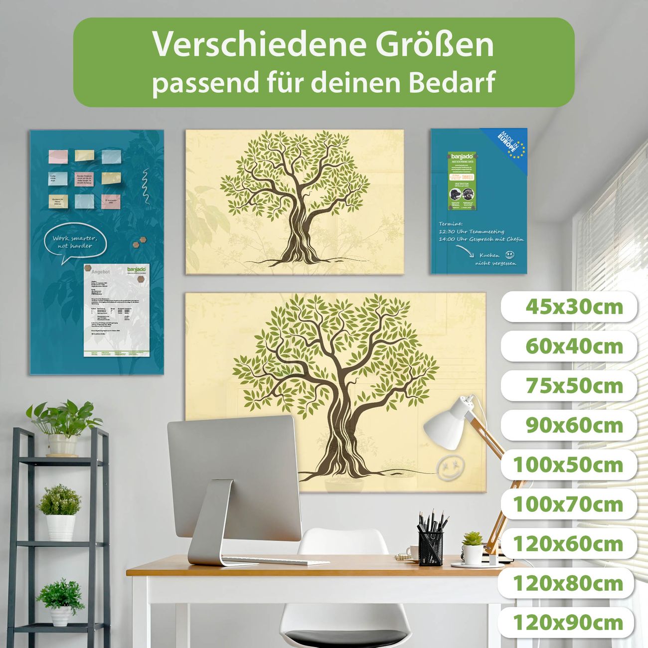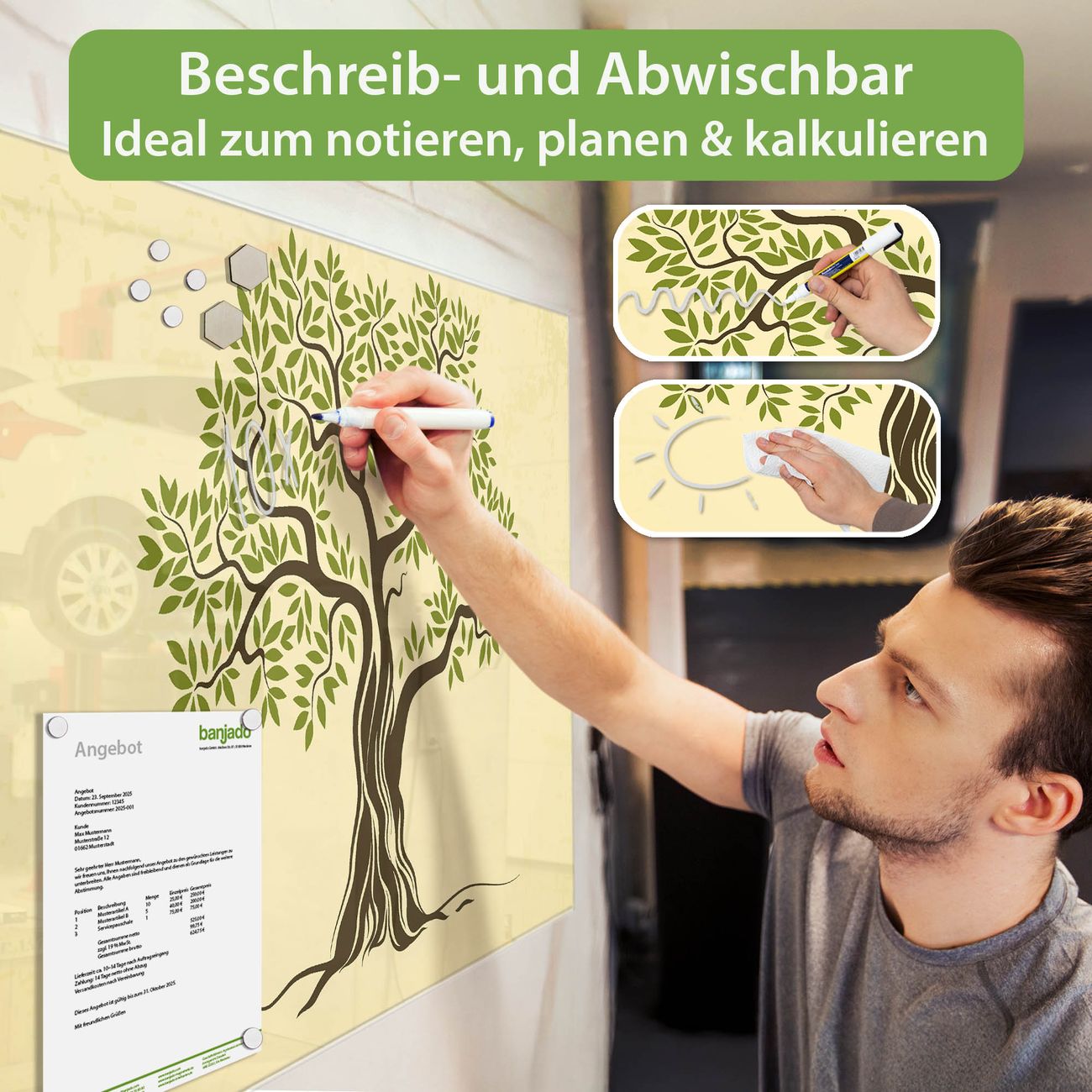 Material: 4mm Sicherheitsglas mit Metallrückwand Eigenschaften: beschreibbar, magnetisch, kratzfest Maße: 75x50x0,6cm, 5,63kg schwer Motiv Nummer 11129 Olivenbaum Zubehör: inklusive 4 Neodym-Magnete