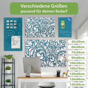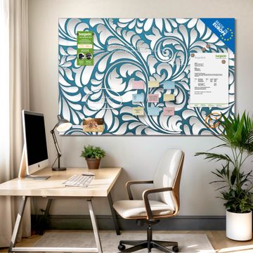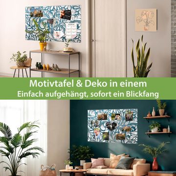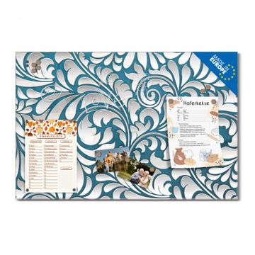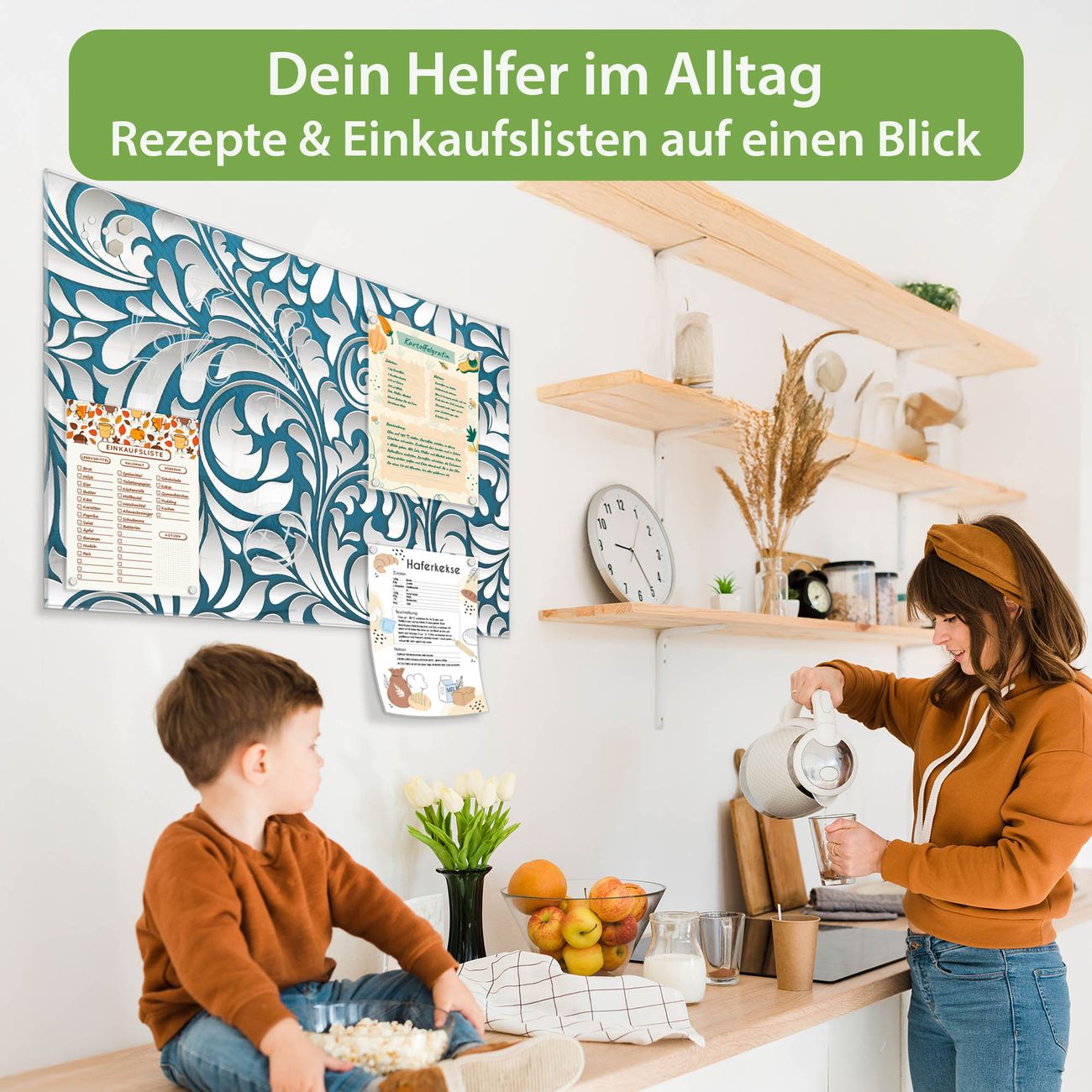 Material: 4mm Sicherheitsglas mit Metallrückwand Eigenschaften: beschreibbar, magnetisch, kratzfest Maße: 45x30x0,6cm, 2,03kg schwer Motiv Nummer 12197 Opulente Ranke Zubehör: inklusive 4 Neodym-Magnete