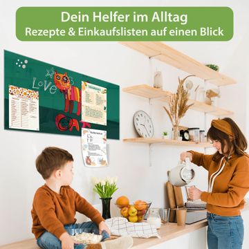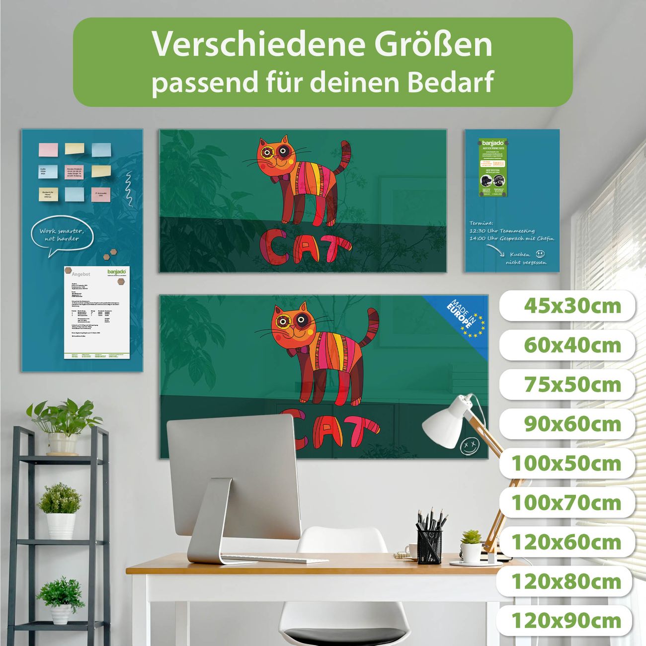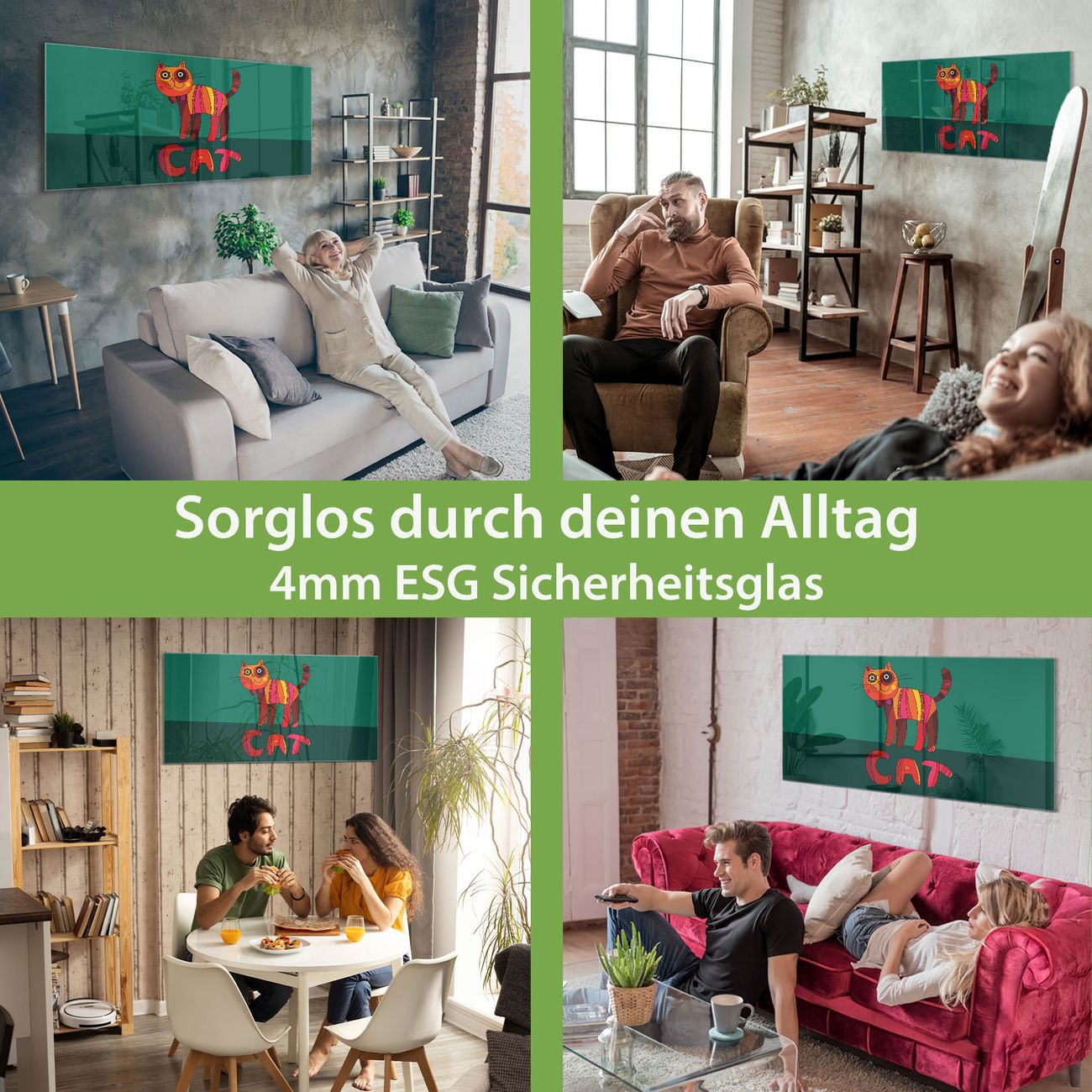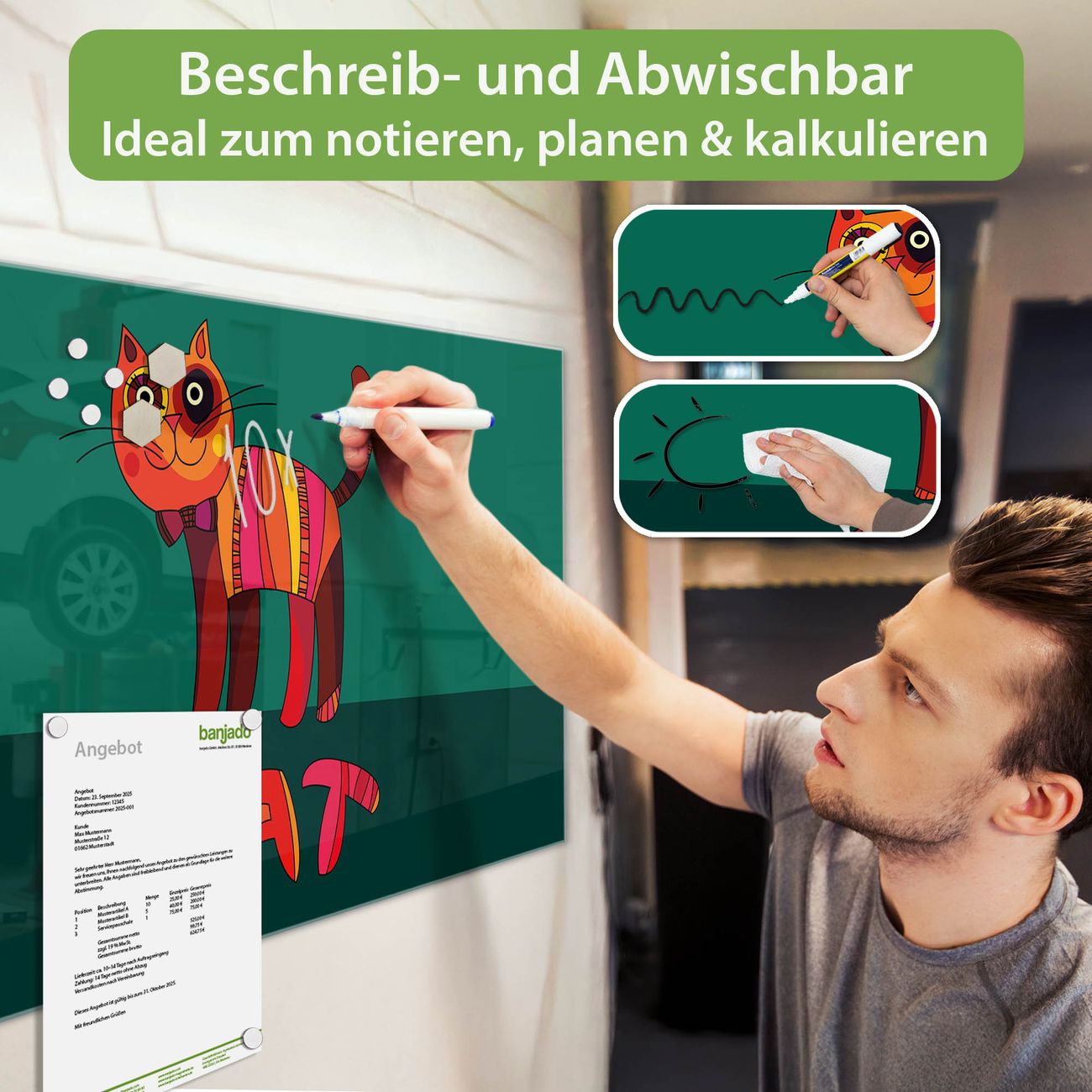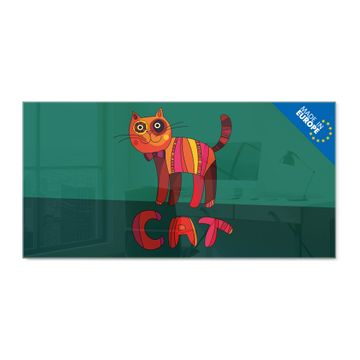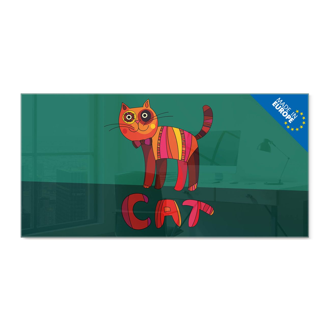 Material: 4mm Sicherheitsglas mit Metallrückwand Eigenschaften: beschreibbar, magnetisch, kratzfest Maße: 100x50x0,6cm, 7,50kg schwer Motiv Nummer 11029 Orange Katze Zubehör: inklusive 4 Neodym-Magnete