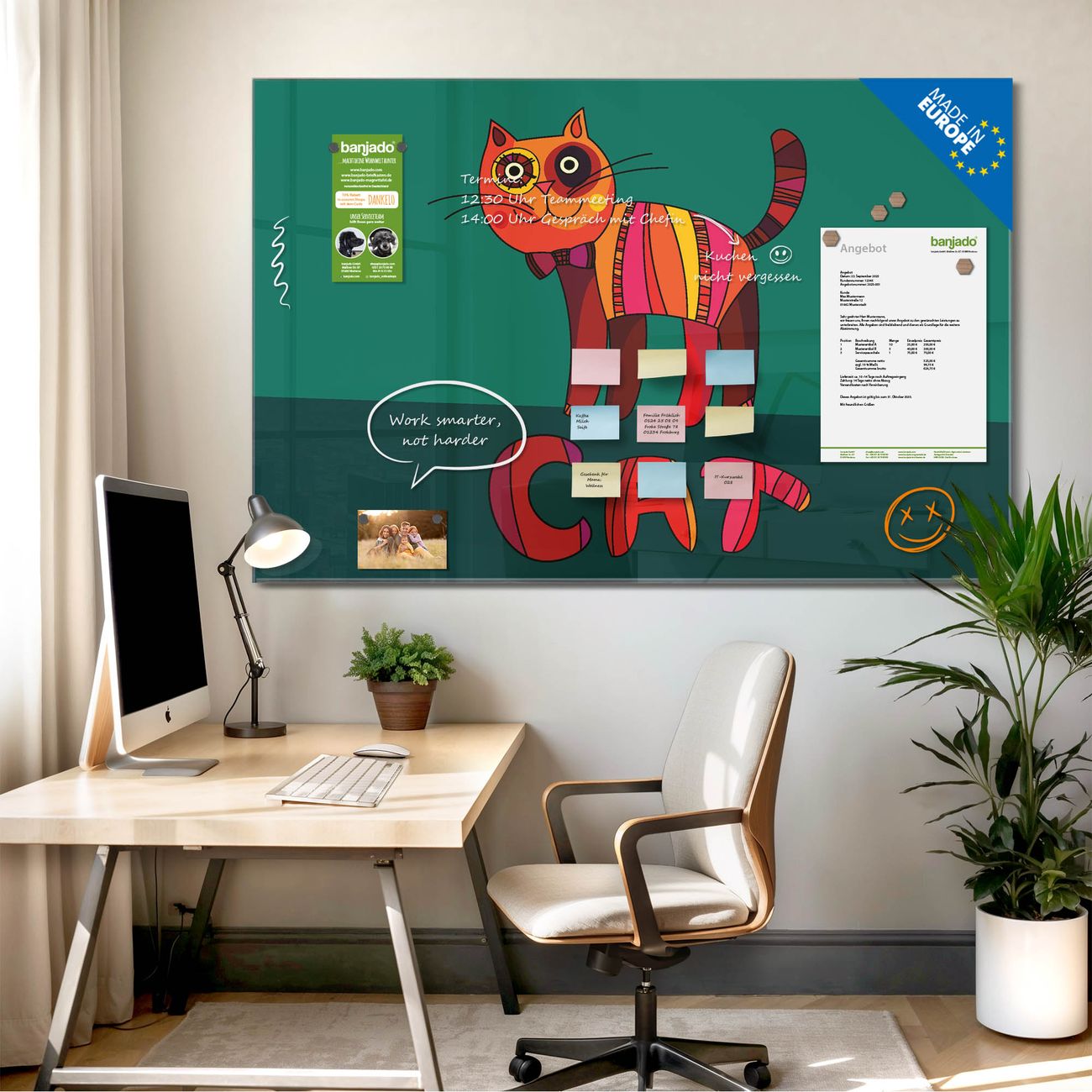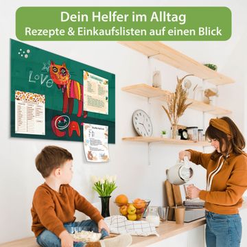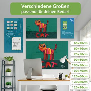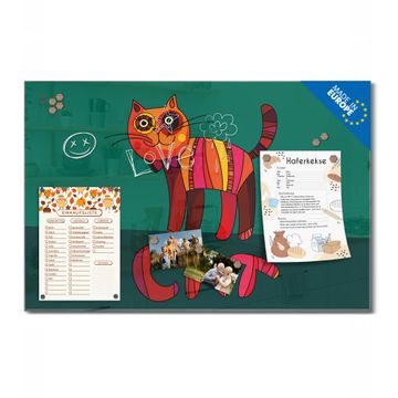 Material: 4mm Sicherheitsglas mit Metallrückwand Eigenschaften: beschreibbar, magnetisch, kratzfest Maße: 120x60x0,6cm, 10,80kg schwer Motiv Nummer 11029 Orange Katze Zubehör: inklusive 4 Neodym-Magnete