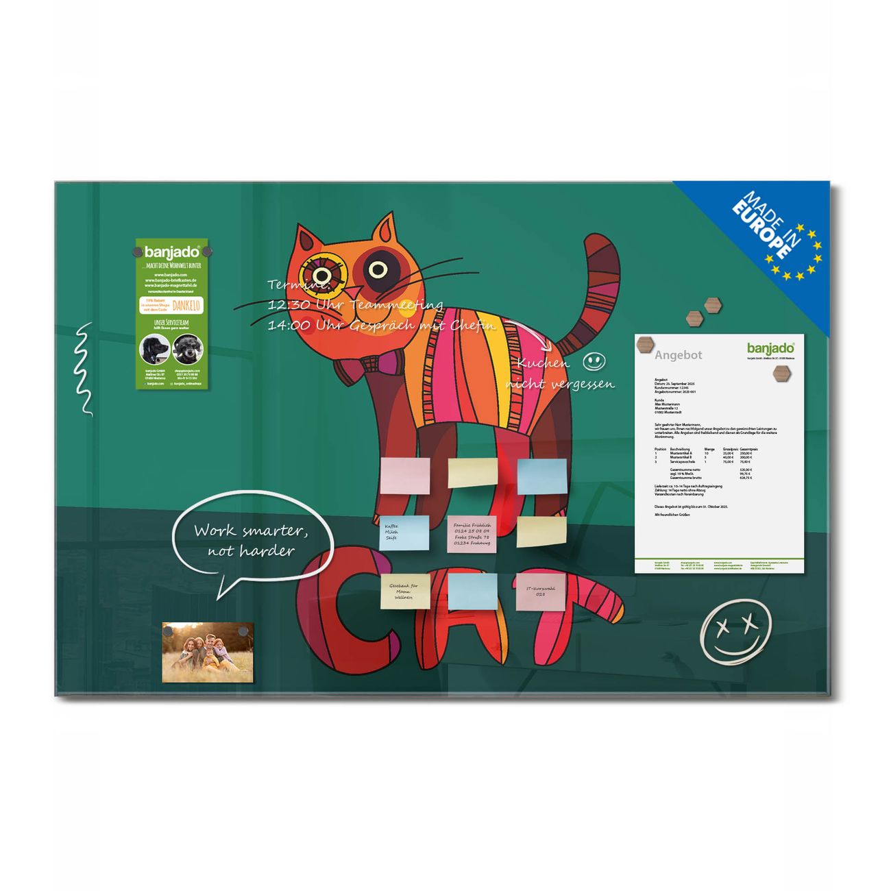 Material: 4mm Sicherheitsglas mit Metallrückwand Eigenschaften: beschreibbar, magnetisch, kratzfest Maße: 120x80x0,6cm, 14,40kg schwer Motiv Nummer 11029 Orange Katze Zubehör: inklusive 4 Neodym-Magnete