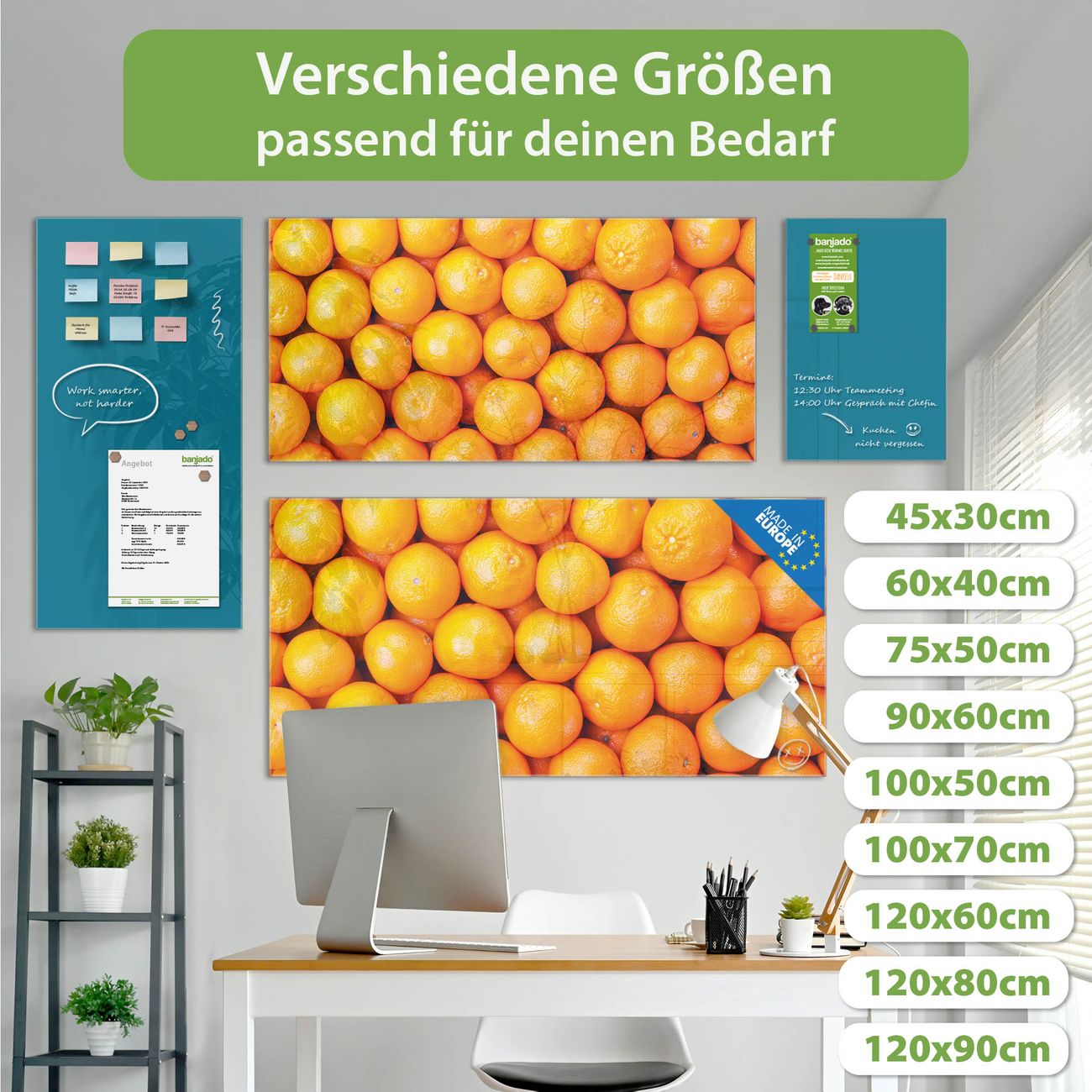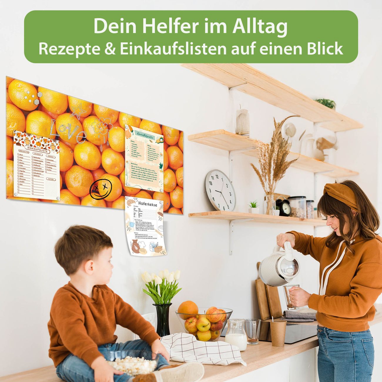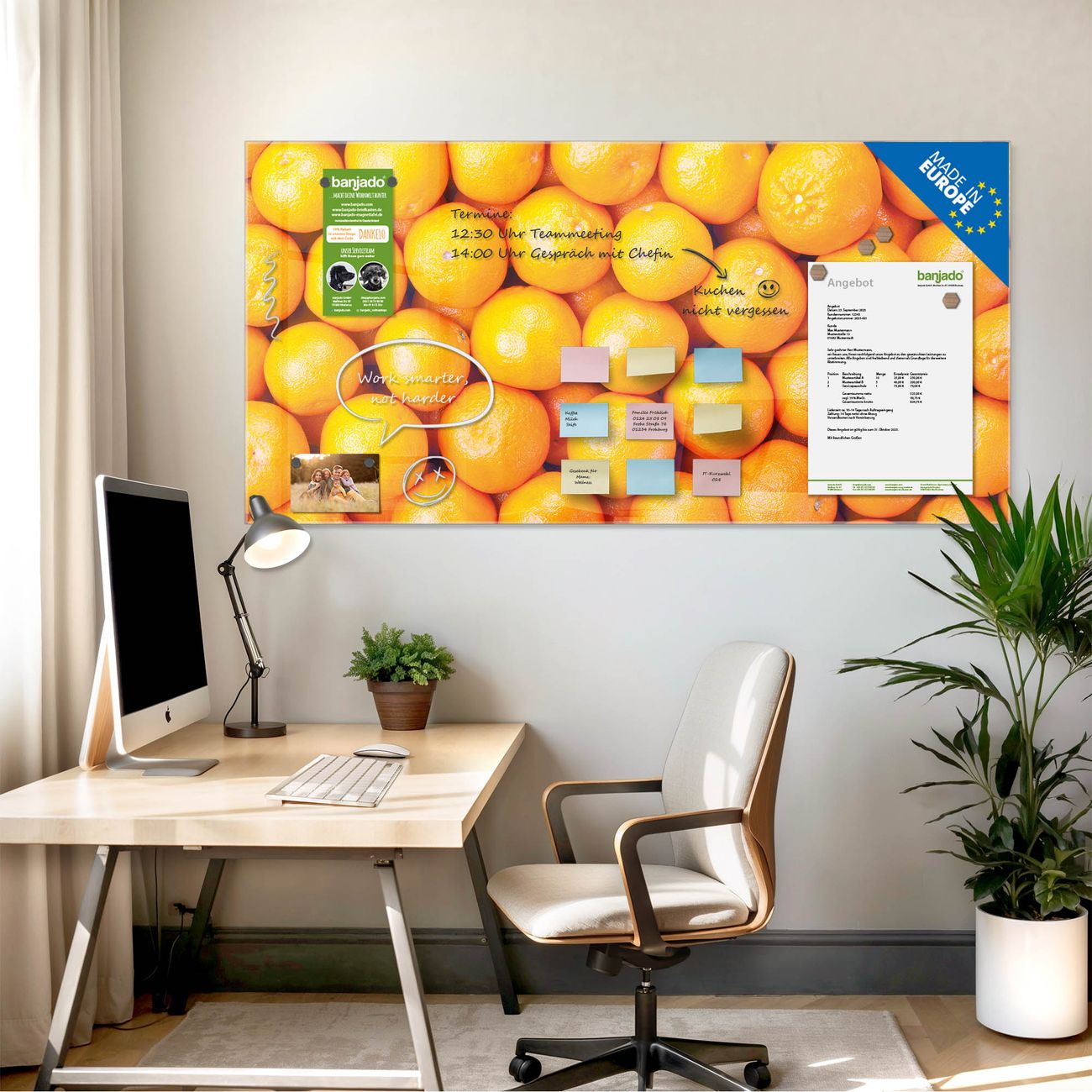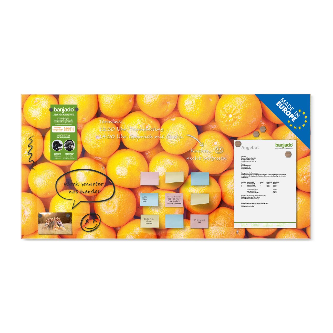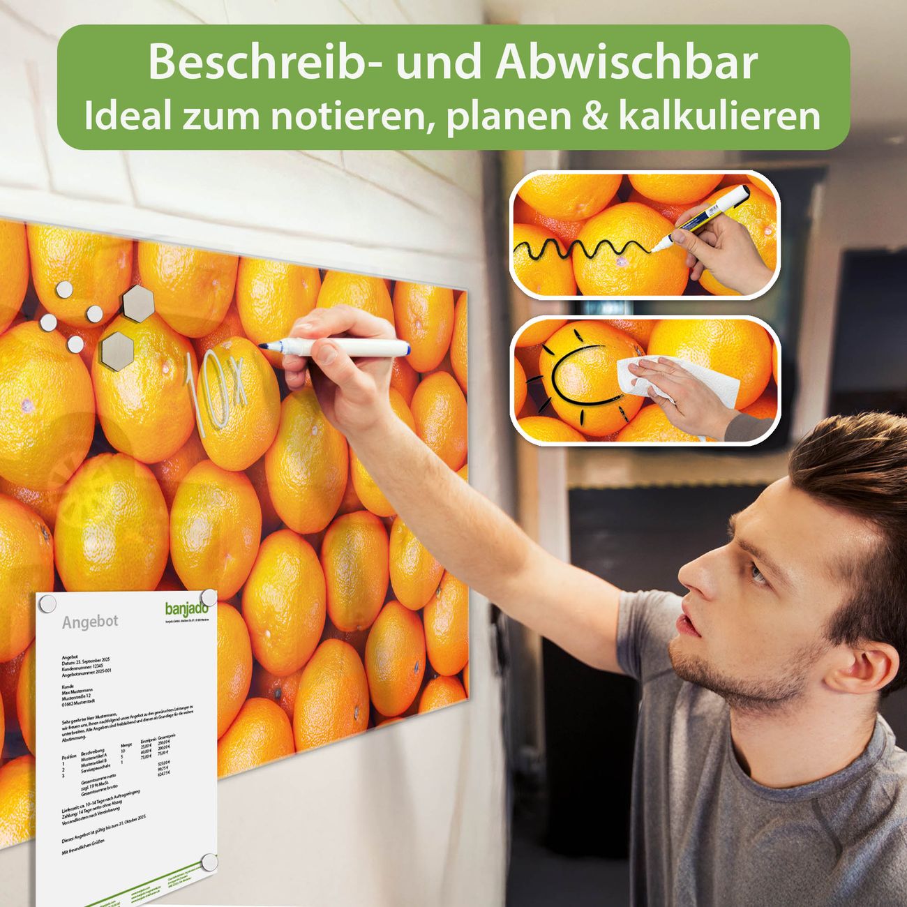 Material: 4mm Sicherheitsglas mit Metallrückwand Eigenschaften: beschreibbar, magnetisch, kratzfest Maße: 100x50x0,6cm, 7,50kg schwer Motiv Nummer 10467 Orangen Zubehör: inklusive 4 Neodym-Magnete