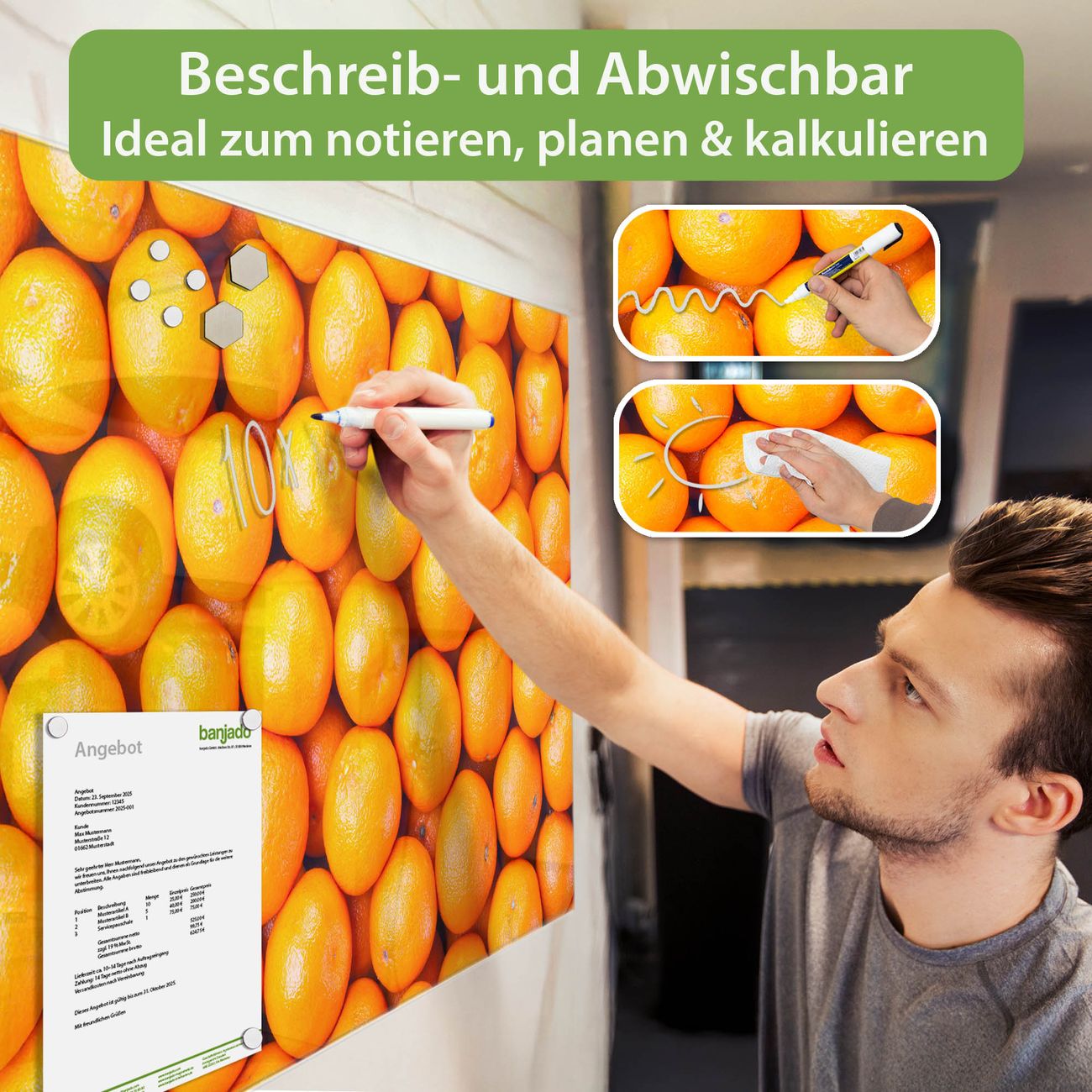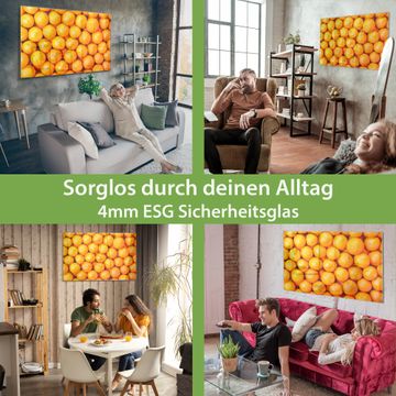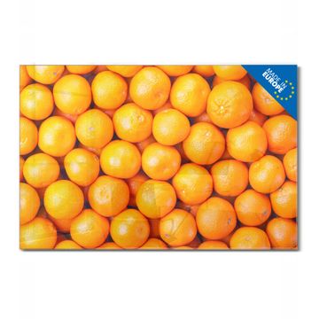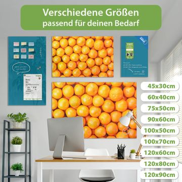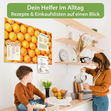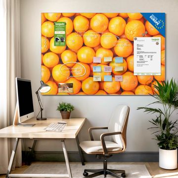 Material: 4mm Sicherheitsglas mit Metallrückwand Eigenschaften: beschreibbar, magnetisch, kratzfest Maße: 75x50x0,6cm, 5,63kg schwer Motiv Nummer 10467 Orangen Zubehör: inklusive 4 Neodym-Magnete