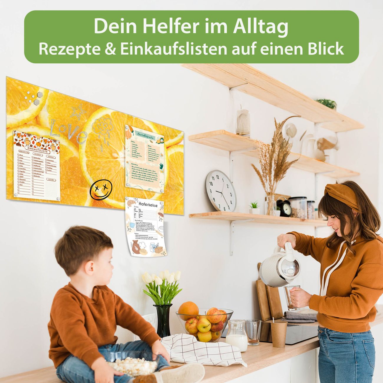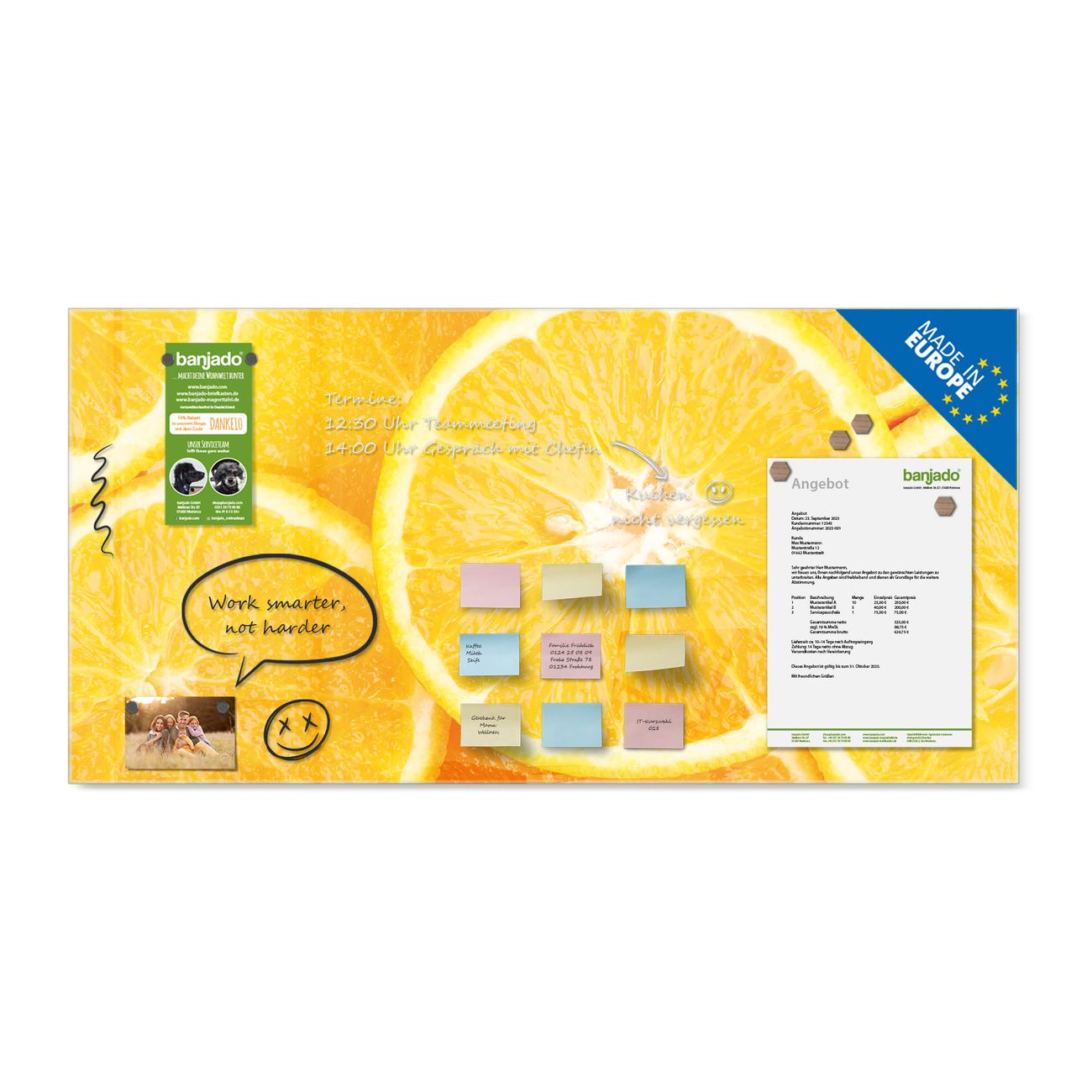 Ein Stück Design, das Ihren Alltag organisiert. Schreiben, heften, inspirieren - alles an einem Ort. Qualität, die man spürt. Montage leicht gemacht. Handwerk mit Herz - veredelt in Sachsen. Einzigartiges Design mit Motiv Motiv Orangenscheiben Beschreibbare Glasoberfläche, leicht zu reinigen Starke Magnetkraft durch Stahlrückwand Inklusive 4 Neodym-Magneten Flexible Montageoptionen Handveredelt in Sachsen - Qualität, die bleibt