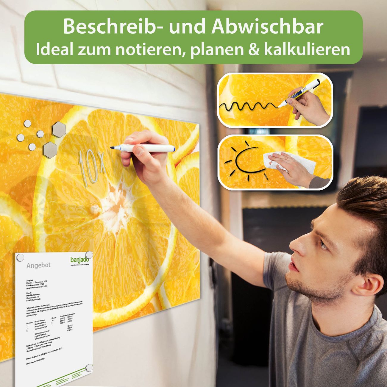 Jede Glas Magnettafel wird in unserer Werkstatt von Hand gefertigt und sorgfältig geprüft. So erhalten Sie ein echtes Qualitätsprodukt, das Funktion und Ästhetik perfekt vereint.?? Warum banjado?