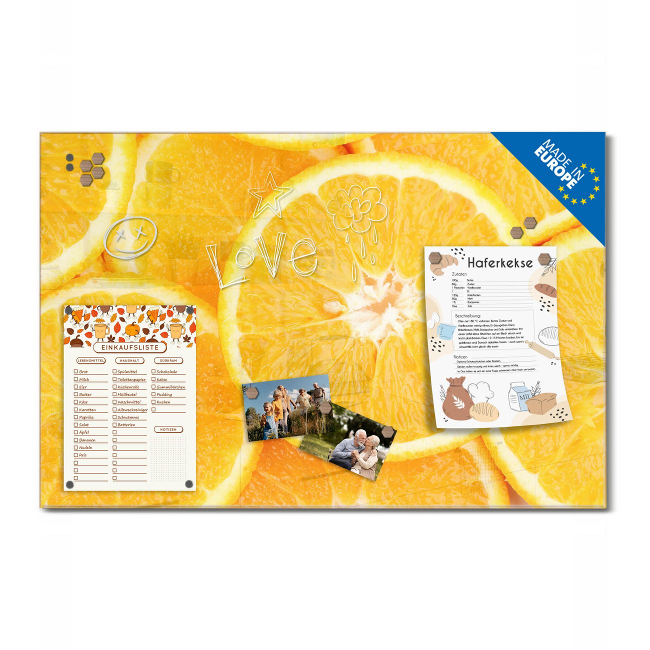 Ein Stück Design, das Ihren Alltag organisiert. Schreiben, heften, inspirieren - alles an einem Ort. Qualität, die man spürt. Montage leicht gemacht. Handwerk mit Herz - veredelt in Sachsen. Einzigartiges Design mit Motiv Motiv Orangenscheiben Beschreibbare Glasoberfläche, leicht zu reinigen Starke Magnetkraft durch Stahlrückwand Inklusive 4 Neodym-Magneten Flexible Montageoptionen Handveredelt in Sachsen - Qualität, die bleibt