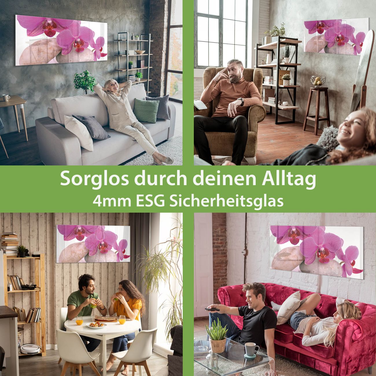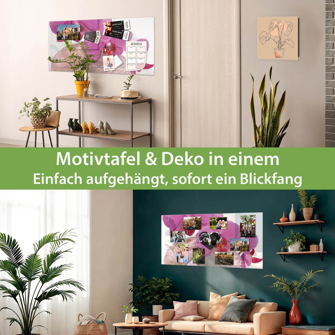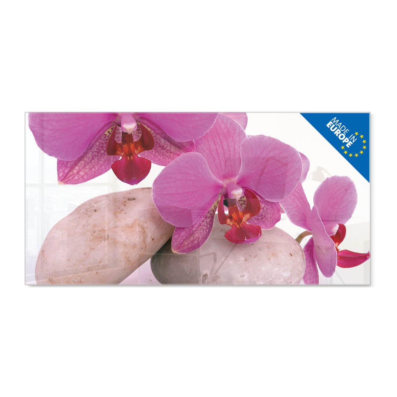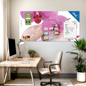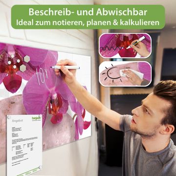 Material: 4mm Sicherheitsglas mit Metallrückwand Eigenschaften: beschreibbar, magnetisch, kratzfest Maße: 100x50x0,6cm, 7,50kg schwer Motiv Nummer 10086 Orchidee Zubehör: inklusive 4 Neodym-Magnete