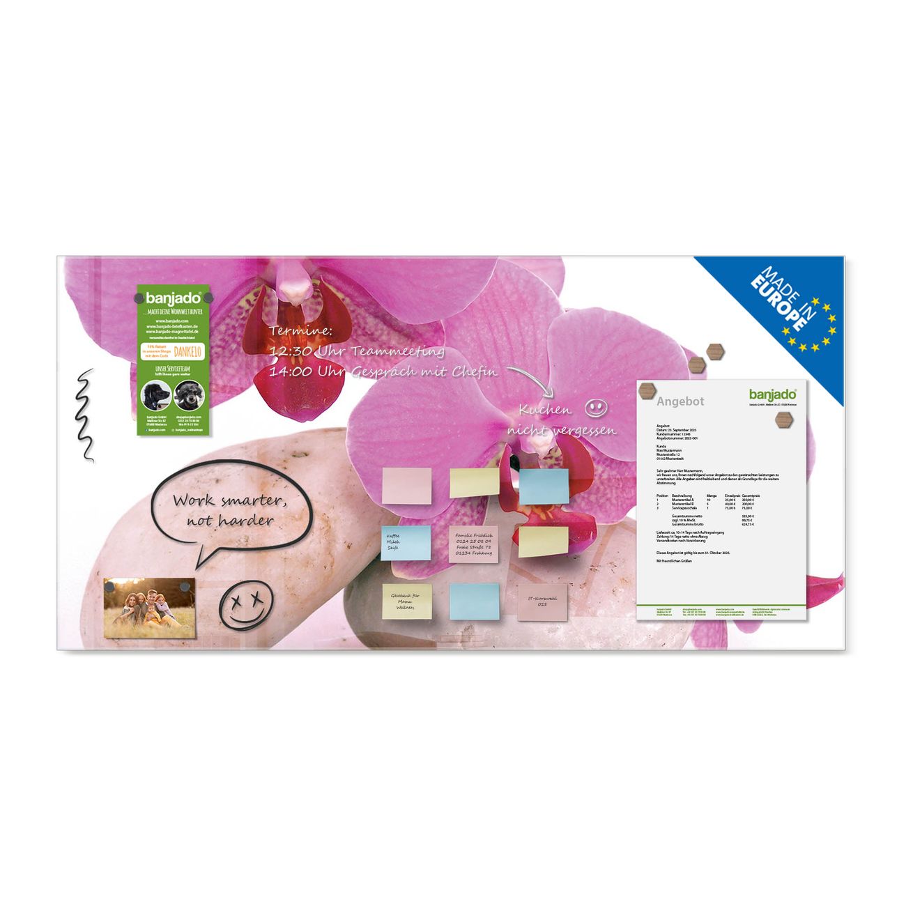 Jede Glas Magnettafel wird in unserer Werkstatt von Hand gefertigt und sorgfältig geprüft. So erhalten Sie ein echtes Qualitätsprodukt, das Funktion und Ästhetik perfekt vereint.?? Warum banjado?