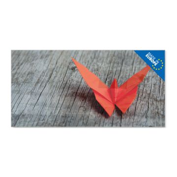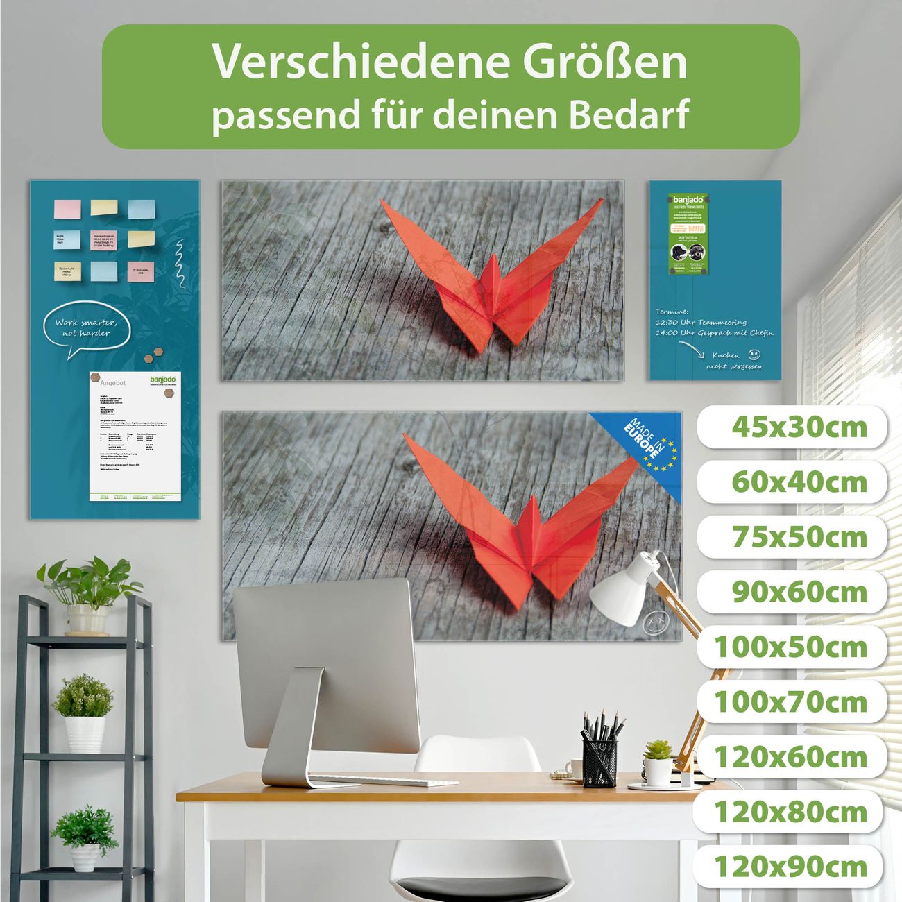 Material: 4mm Sicherheitsglas mit Metallrückwand Eigenschaften: beschreibbar, magnetisch, kratzfest Maße: 110x55x0,6cm, 9,08kg schwer Motiv Nummer 10272 Origami Schmetterling Zubehör: inklusive 4 Neodym-Magnete